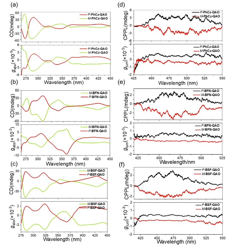 图 3 (a、b、c)稀甲苯溶液(10-5 摩尔 / 升)中 M/P - 苯基咔唑 - 醌吖啶酮、M/P - 二苯并呋喃 - 醌吖啶酮和 M/P - 二苯并噻吩 - 醌吖啶酮的圆二色谱及吸收不对称因子随波长变化曲线;(d、e、f)稀甲苯溶液(10-5 摩尔 / 升)中 M/P - 苯基咔唑 - 醌吖啶酮、M/P - 二苯并呋喃 - 醌吖啶酮和 M/P - 二苯并噻吩 - 醌吖啶酮的圆偏振发光光谱及发光不对称因子随波长变化曲线(激发波长 = 300 纳米)