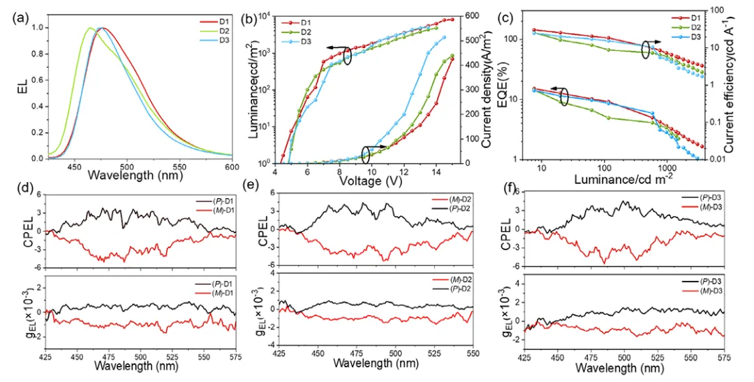 图 4 器件 D1、D2、D3 的有机发光二极管性能:(a)7V 下测得的归一化电致发光光谱;(b)电流效率 - 亮度和外量子效率 - 亮度曲线;(c)电流密度 - 电压 - 亮度特性曲线;(d、e、f)7V 下M/P-D1、M/P-D2 和 M/P-D3 的圆偏振电致发光光谱及圆偏振电致发光不对称因子随波长变化曲线