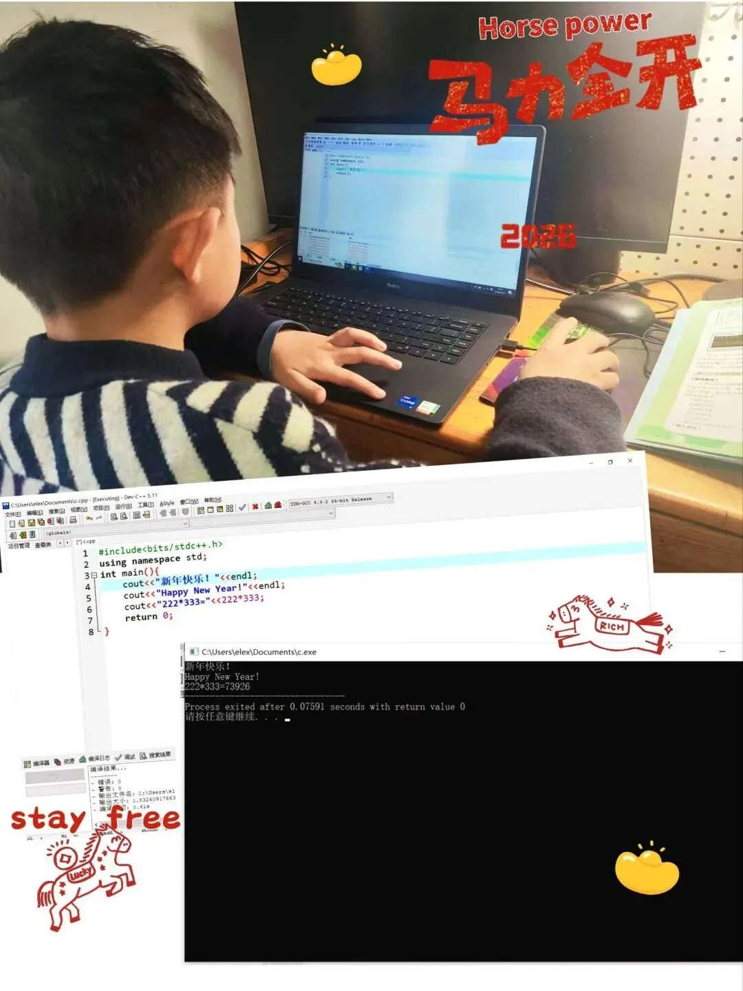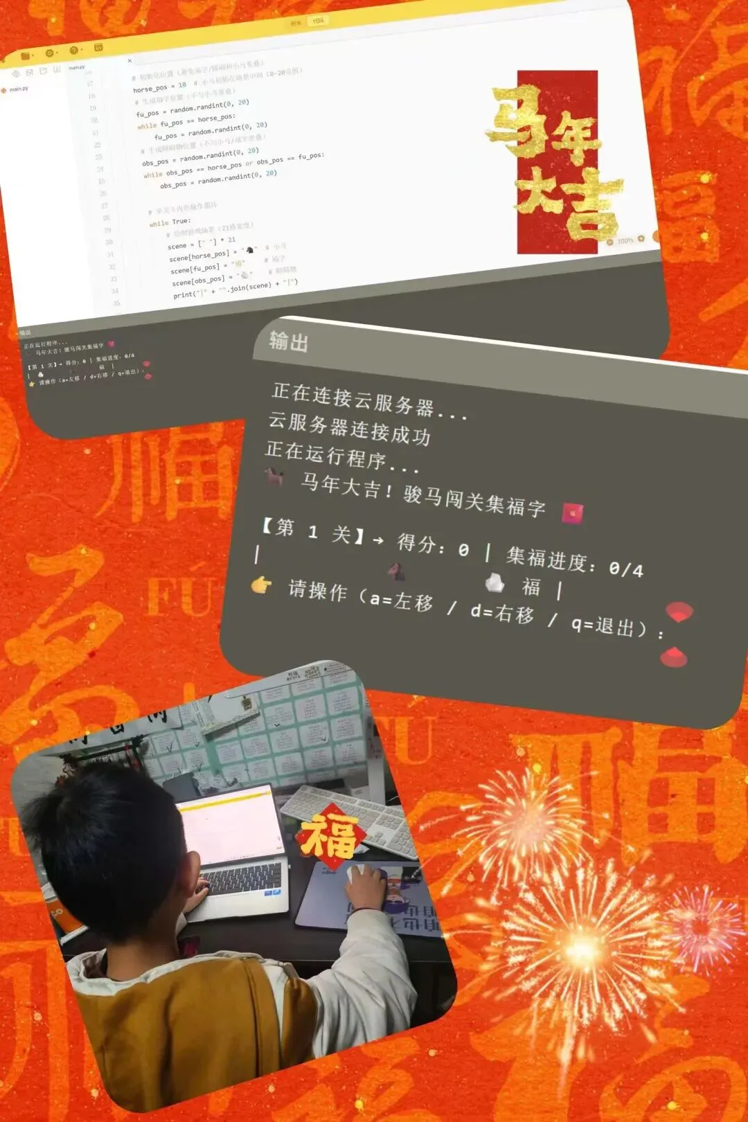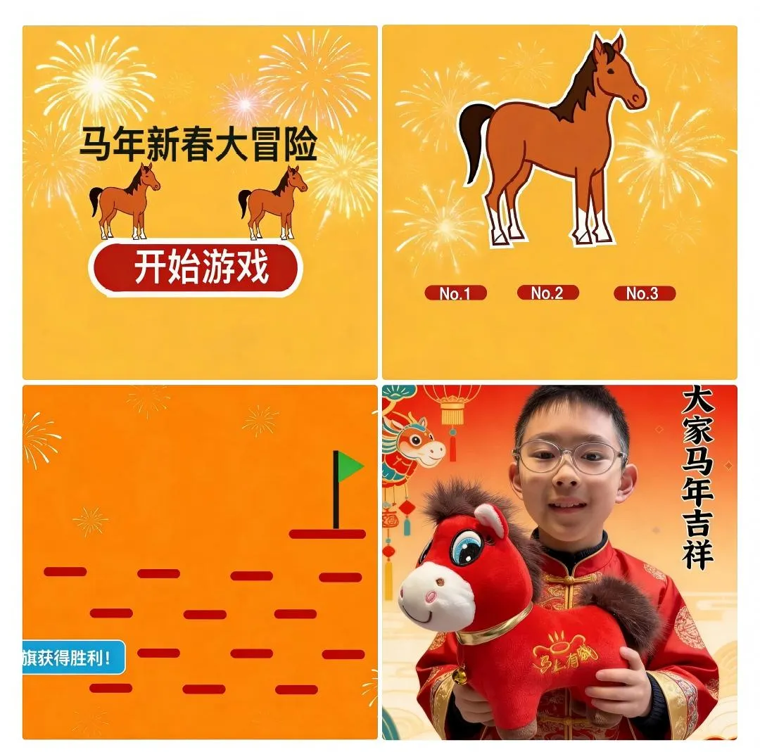数字赋能成长,智趣点亮新春。中高年级同学化身科技小创客,在数字化实践中展现创新活力。大家运用编程软件设计 “骏马闯关集福字”“新春红包大冒险” 等马年主题小游戏,设置趣味关卡与新春特效,认真记录开发过程、撰写心得。同时,同学们借助 APP 制作智能电子相册,利用 AI 工具创作祝福图片、对联、诗歌与短视频,以科技为笔、以创新为墨,展现新时代少年的智慧与风采。