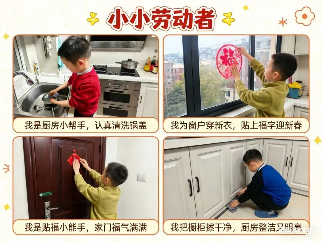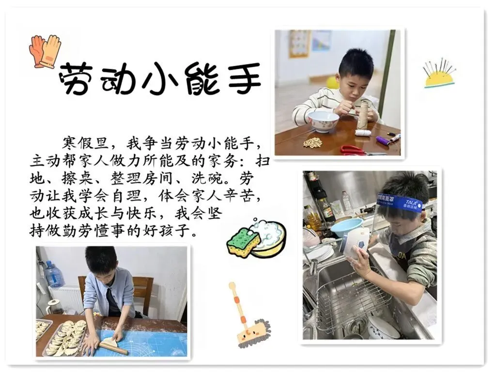 劳动淬炼成长,家国根植心间。“心有家国・未来可期” 主题实践让责任与担当扎根童心,低年级同学争当小小劳动者,积极参与大扫除、贴春联、包饺子等家务,学习洗碗、整理房间等生活技能,并用图文记录劳动瞬间。大家在动手实践中体会劳动的快乐,感受父母的辛劳,在点滴付出中学会感恩与担当,成长为热爱劳动、懂得珍惜的好少年。