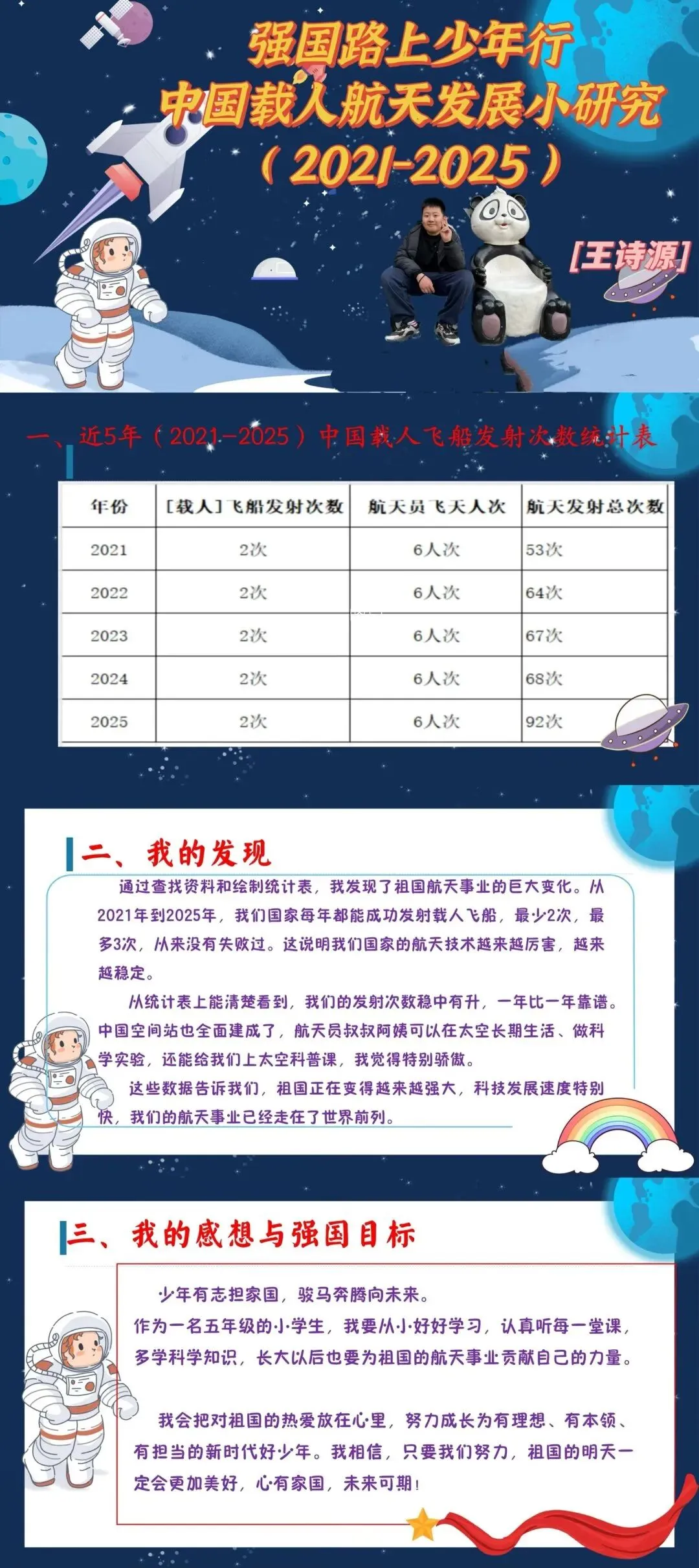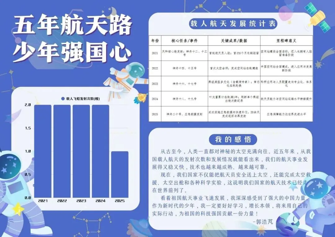 少年有志担家国,骏马奔腾向未来。中高年级同学在主动分担家务、体谅父母辛劳的同时,把目光投向祖国的蓬勃发展。大家聚焦载人航天、卫星导航、人工智能等重大科技创新成果,查阅资料、搜集数据、绘制统计图表,在直观对比中感受祖国五年来的辉煌成就,树立远大理想,厚植家国情怀,立志以少年之力担强国之任。