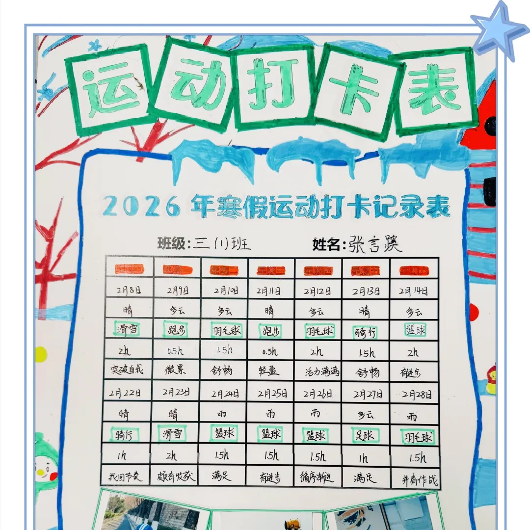 生命在于运动,健康铸就未来。假期中,同学们坚持每日运动 30 分钟以上。低年级同学通过跳绳、踢毽子、亲子瑜伽等项目提升协调能力,模仿骏马奔跑尽享乐趣;中高年级同学开展篮球、羽毛球、长跑等训练,增强力量与技巧。大家认真制作运动记录表,在规律锻炼中练就强健体魄,以昂扬姿态迎接新春。