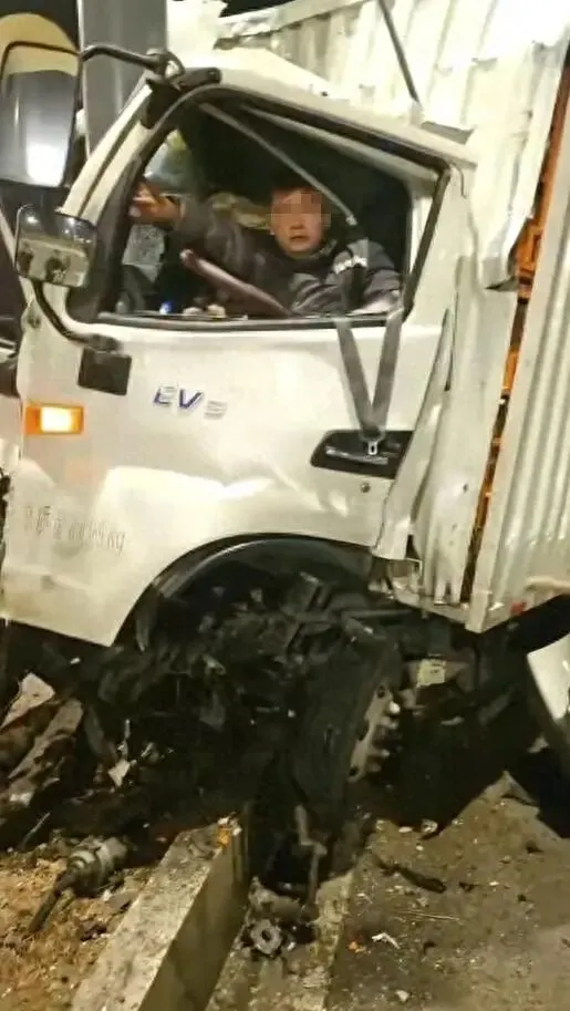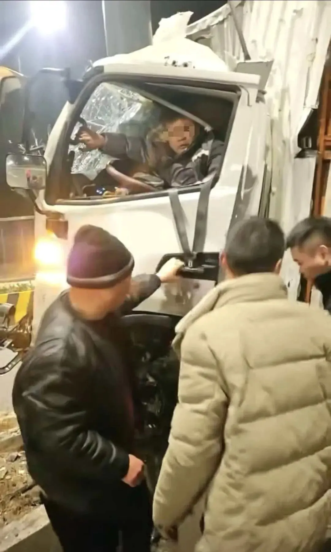厢式货车撞到路边,驾驶室严重受损,司机被卡其中,车底已开始着火,凌晨时分,南京的何女士目击了这样一起交通事故,并和家人积极上前施救。