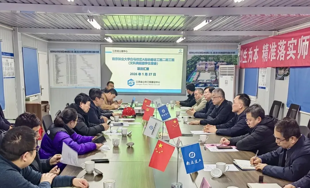 慰问结束后,张钧一行在项目部会议室召开座谈交流会。南京林业大学副校长聂永江、基建处处长秦天堂,省公建中心党总支书记高飞及各参建单位代表参会。会上,各方就项目建设进展、安全管理举措及后续施工计划作详细汇报。省住建厅对项目整体建设成效及提前完成阶段性节点任务的成绩给予充分肯定,要求参建各方凝聚合力、强化统筹,严格落实政府投资工程集中建设管理要求,以高标准、高质量推进后续建设,全力打造优质民生工程。