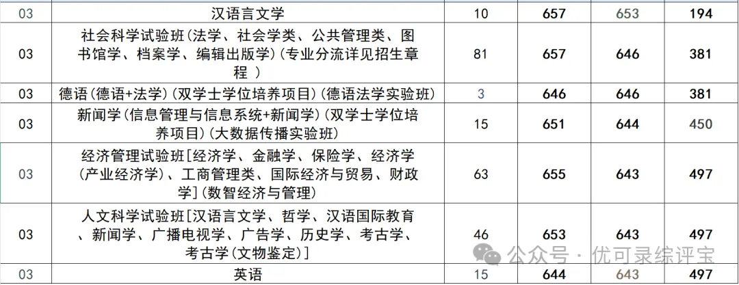 汉语言文学以653分、全省194名登顶文科榜首,不愧是文科皇冠上的明珠。社会科学试验班和德语法学实验班并列第二,646分,381名。经济管理试验班和人文科学试验班最低分643,位次497——这是文科进南大的“基准线”。