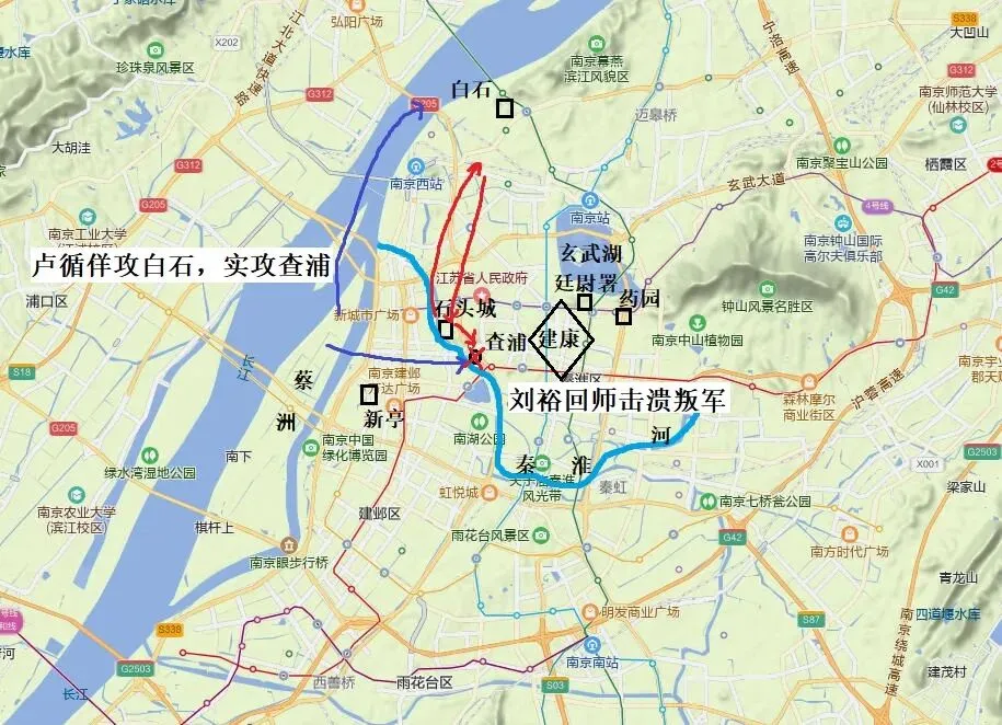 然而刘裕刚刚出兵,卢循便开始了行动,五月二十九日,秦淮水南岸的叛军伏兵骤然杀出,在焚毁查浦的栅栏后,大量叛军从该处登陆上岸,很快进至张侯桥(位于建康城南宣阳门外)。