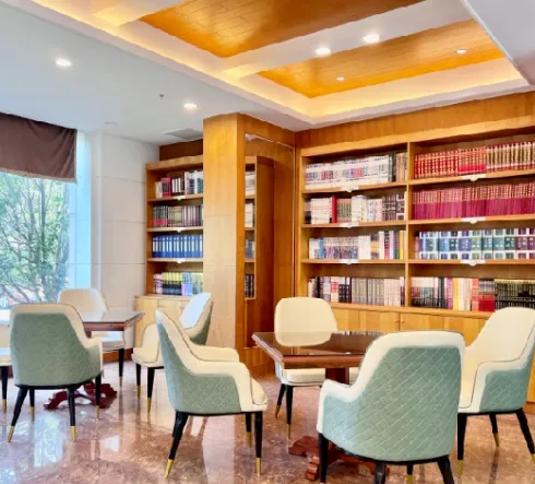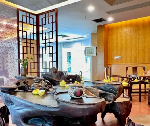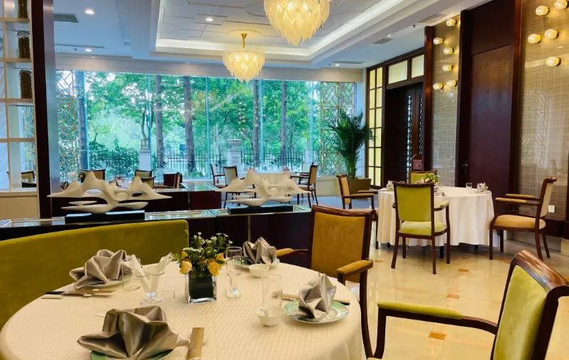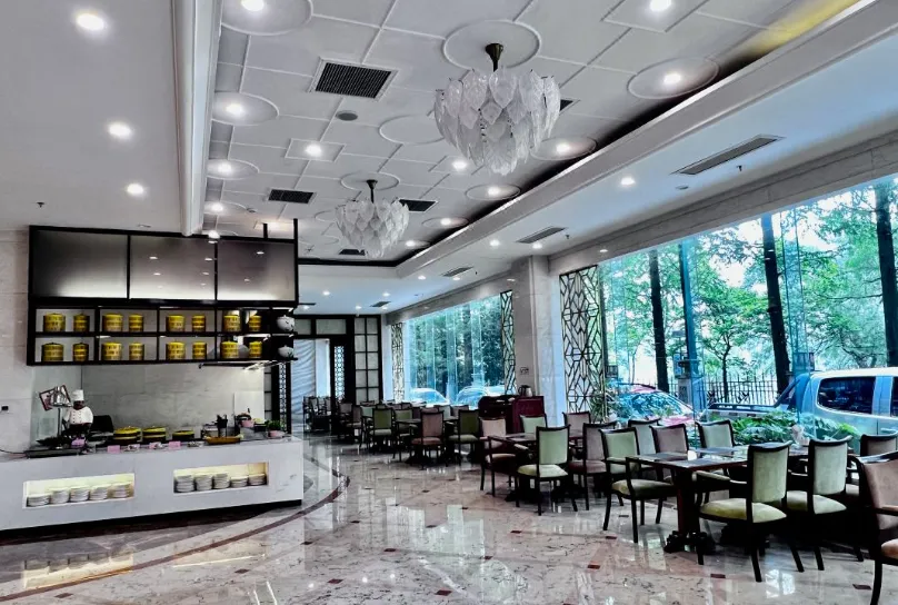 酒店坐落在珍珠泉湖畔,建筑呈半弧形环绕泉水,与湖光山色融为一体,四季景色各异:春季桃红柳绿,夏季林木葱郁,秋季层林尽染,冬季红梅傲雪。泉水晶莹澄澈,气泡如串串珍珠自池底涌出,晴天远眺似“晴雨泉”,击掌时气泡跳跃如“喜客泉”,形成独特的“一泉三景”奇观。
