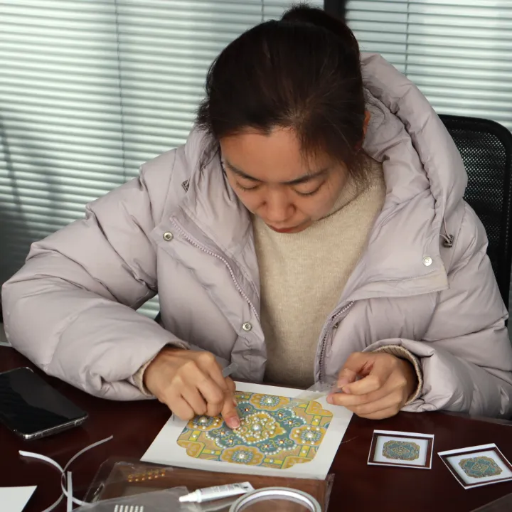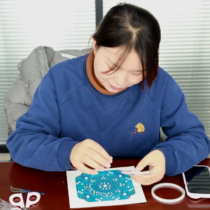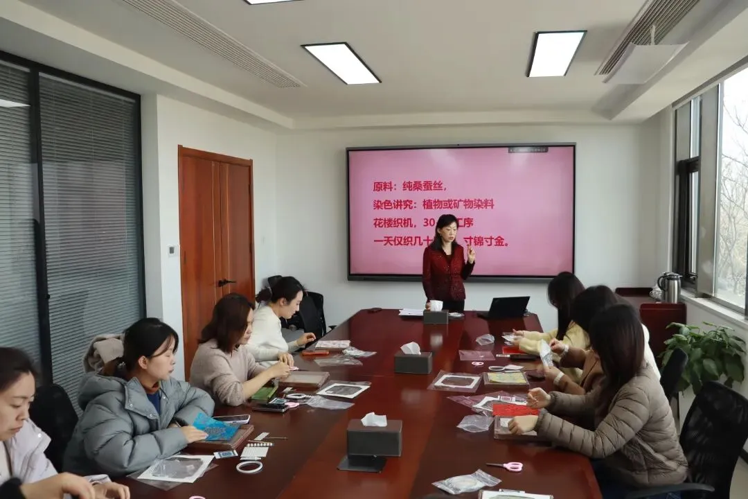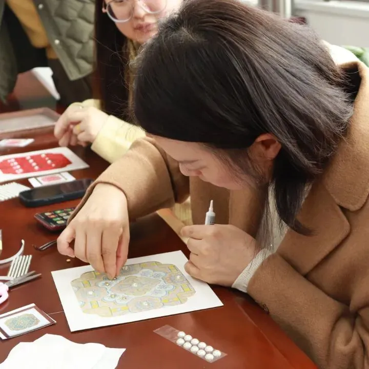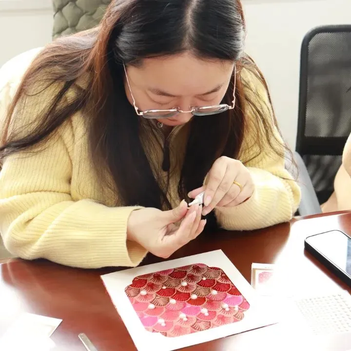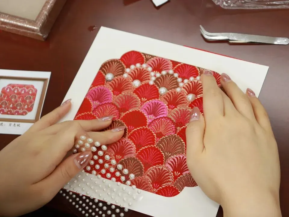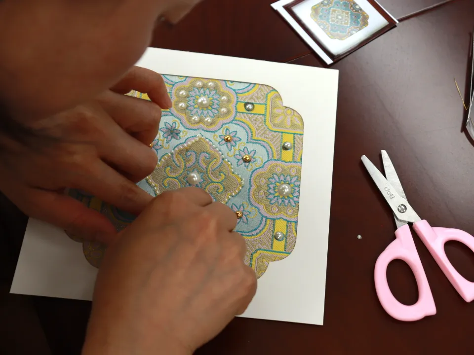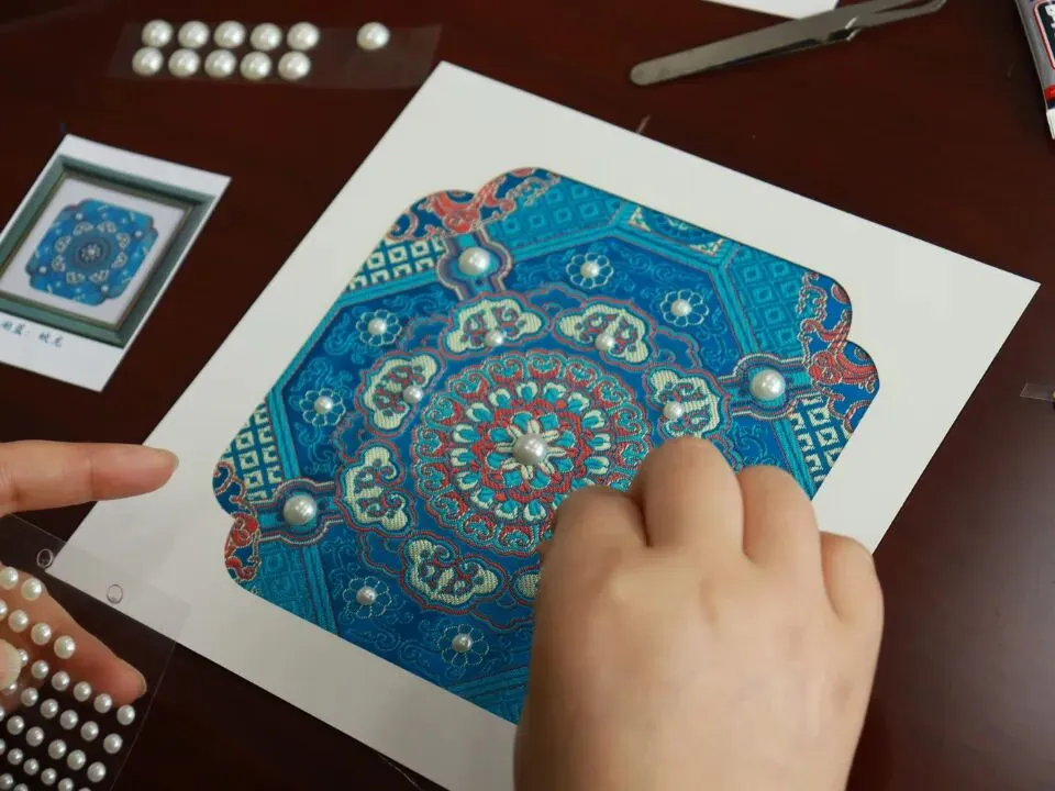 专业老师将分步教学,从底板定位、宋锦裁剪粘贴到珍珠点缀,全程细致指导,确保每位女职工轻松上手。