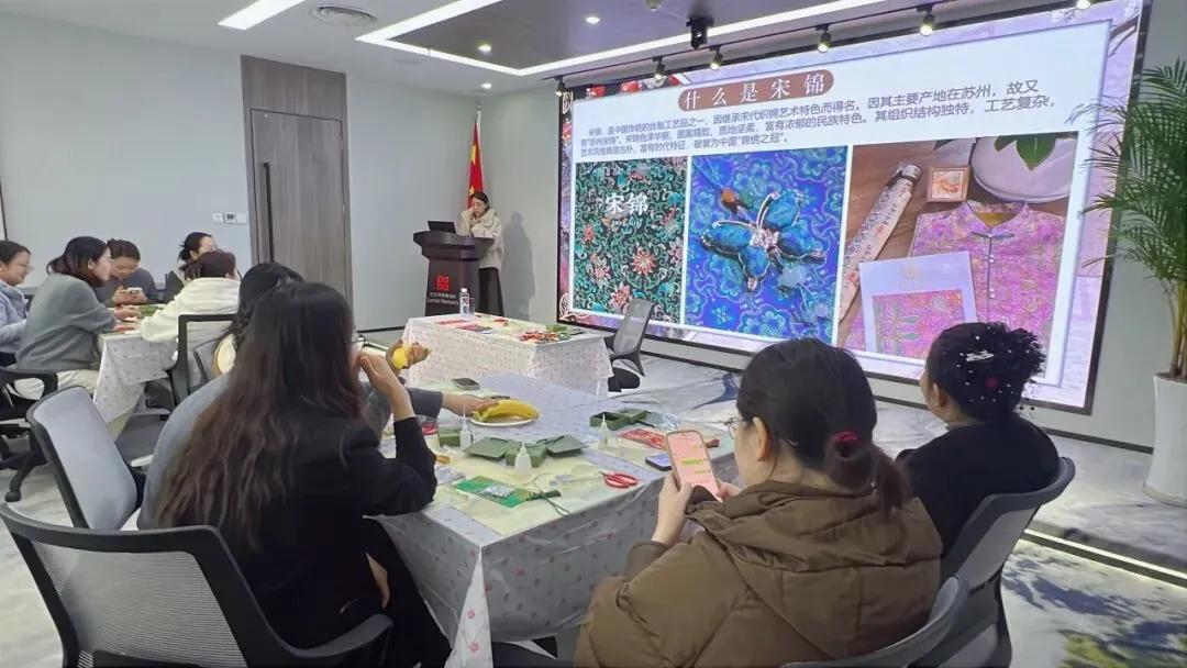 专业老师现场带来宋锦文化分享,从宋锦的历史起源、工艺特点、文化价值,到经典纹样寓意、现代创新应用,娓娓道来。大家认真聆听、不时提问,在图文与实物的展示中,近距离感受千年宋锦的厚重底蕴,对这项国家级非遗技艺有了更深刻的认识。