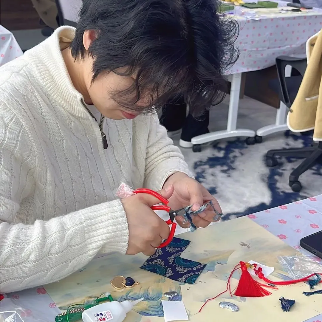 进入手工制作环节,在老师的现场带教指导下,大家拿起材料,从穿线、打结、定型到组装、装饰,一步步耐心制作专属宋锦挂饰。