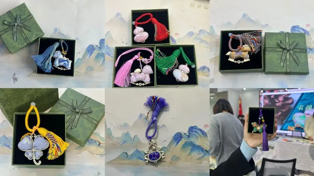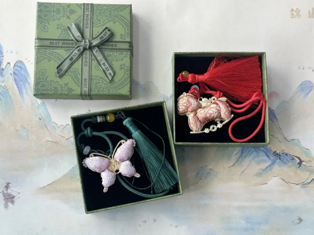 当一件件精致典雅的宋锦挂饰完成,大家纷纷展示自己的手作成果,拍照留念、互相欣赏。每一件作品都独一无二,既藏着非遗工艺之美,也凝聚着制作者的用心与巧思,成为这个妇女节最特别的纪念。