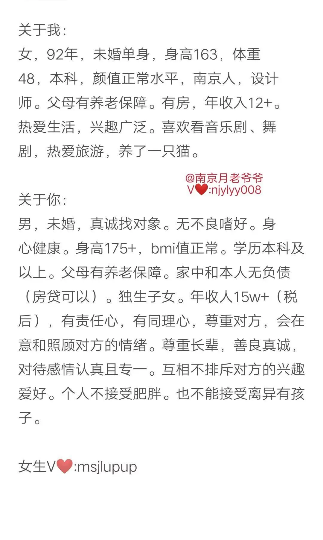 ⑤、【南京月老爷爷牵线(4866)】女,92年,身高162,目前单身,有房,南京浦口人,想找个有独立婚房、年入不低于18万的男友。