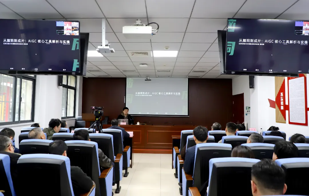 本次培训特邀江苏卫视频道剪辑指导、江苏卫视AIGC融媒应用实验室负责人姜尚清授课。作为媒体融合与AI技术应用的实战专家,姜老师跳出传统理论框架,直击应用场景,结合丰富的融媒案例,现场拆解如何利用AIGC工具快速生成文案、图像、视频的全流程,演示如何通过提示词设计,让AI精准捕捉需求,高效产出内容。从创意构思到素材生成,再到最后的剪辑合成,一场关于内容生产的“新质生产力”变革在课堂上生动上演。
