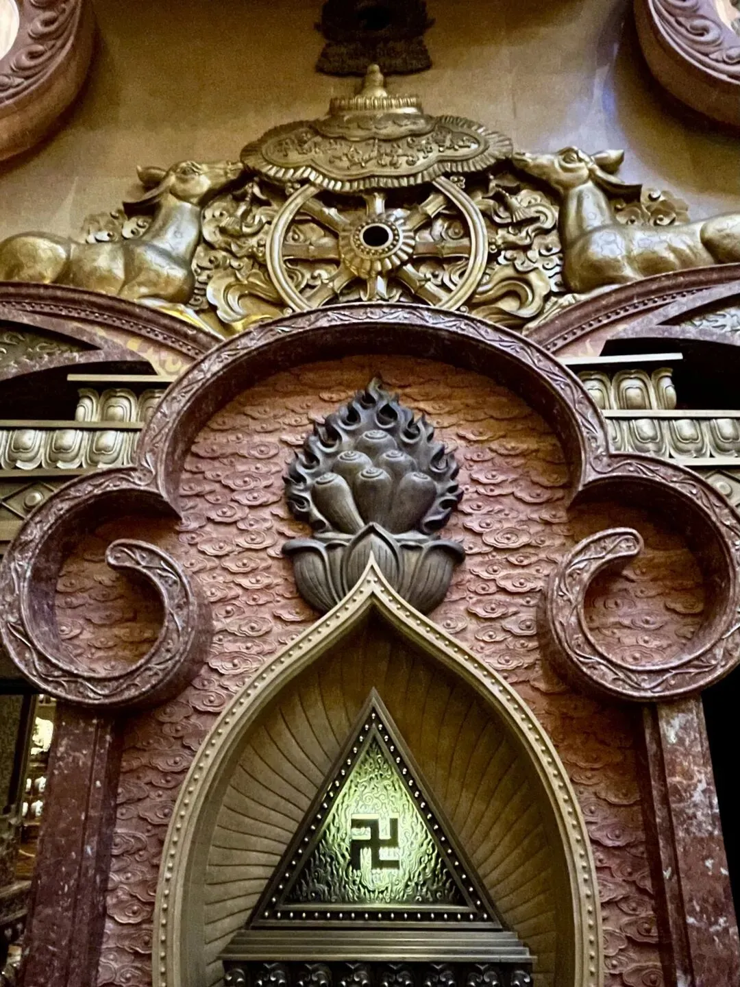 在这“法语流芳” 门前驻足,顶部的“双鹿听法”,中部的“火焰宝莲”,底部的“万字符”,是一件繁美的艺术品,也似乎在散发能量,让我们静下来,再静下来,去聆听自己。