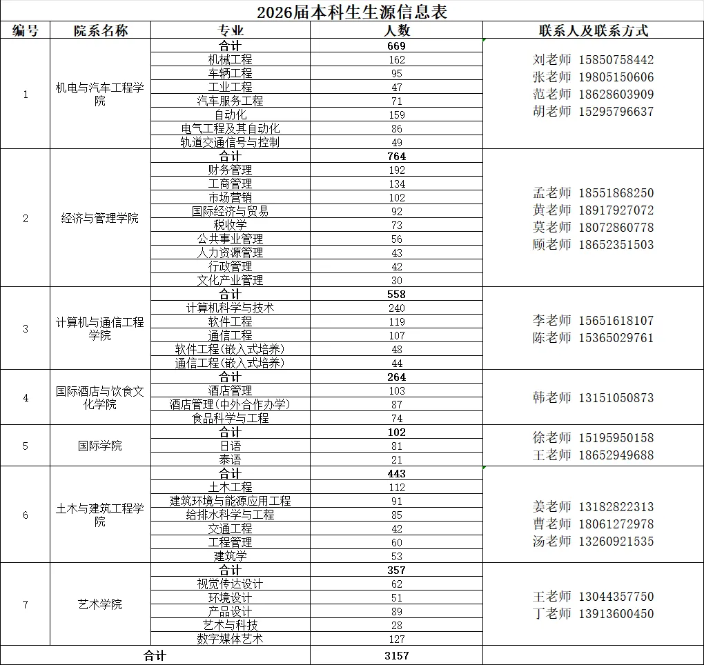 我校开设的专业有:公共事业管理、行政管理、工商管理、酒店管理、食品科学与工程、汽车服务工程、车辆工程、财务管理、工业工程、国际经济与贸易、人力资源管理、市场营销、税收学、文化产业管理、日语、泰语、产品设计、环境设计、视觉传达设计、艺术与科技、轨道交通信号与控制、机械工程、自动化、电气工程及其自动化、给排水科学与工程、工程管理、建筑环境与能源应用工程、建筑学、交通工程、土木工程、计算机科学与技术、通信工程、软件工程。