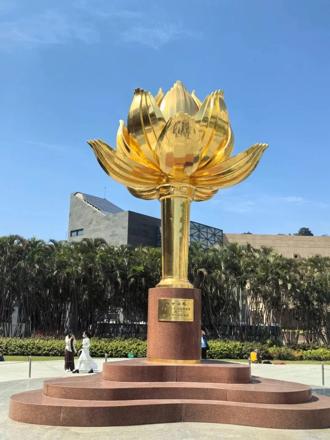 金莲花广场(约20分钟): 为庆祝1999年澳门主权移交而建设的广场,已成为澳门著名地标及旅游景点。“盛世莲花”主体部分由花茎、花瓣和花蕊组成,共16个造型,采用青铜铸造,表面贴金,重6.5吨;基座部分由23块红色花岗岩相叠组成。莲花是中华人民共和国澳门特别行政区区花,莲花盛开,象征澳门永远繁荣昌盛。