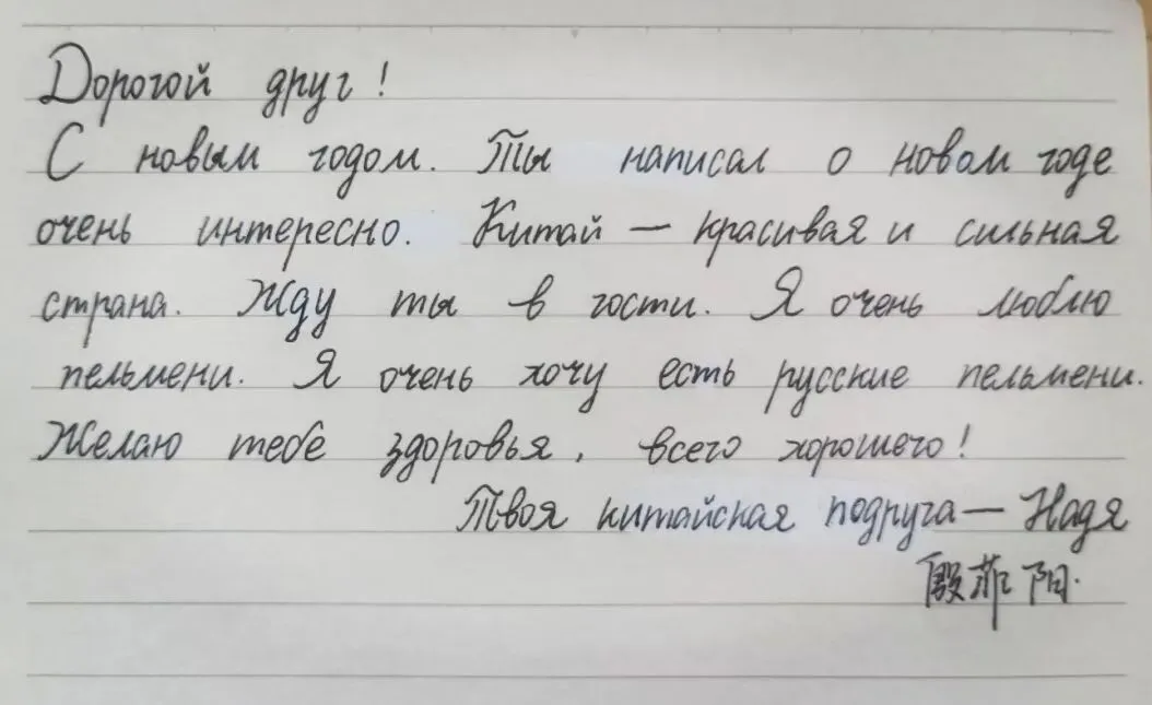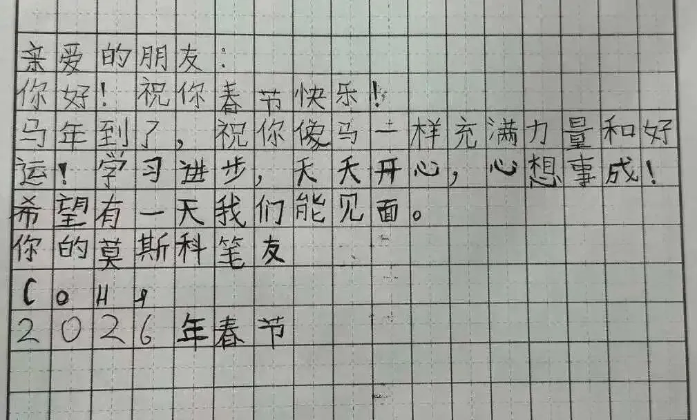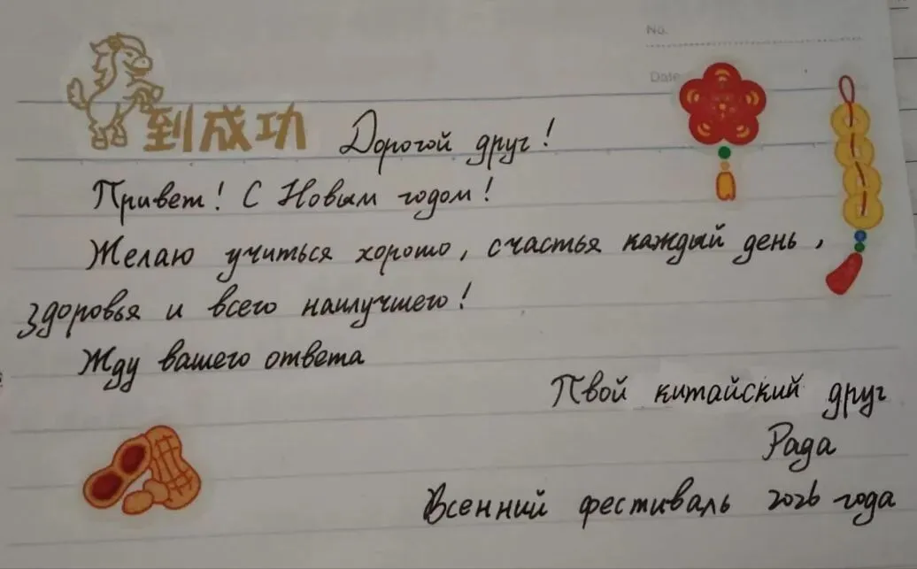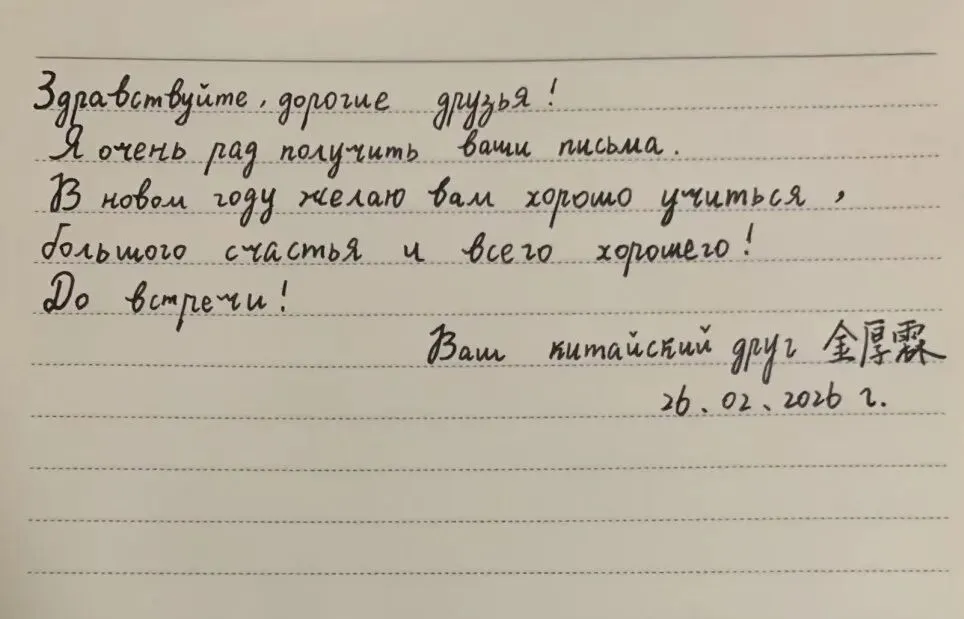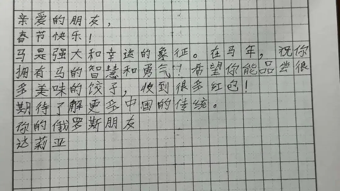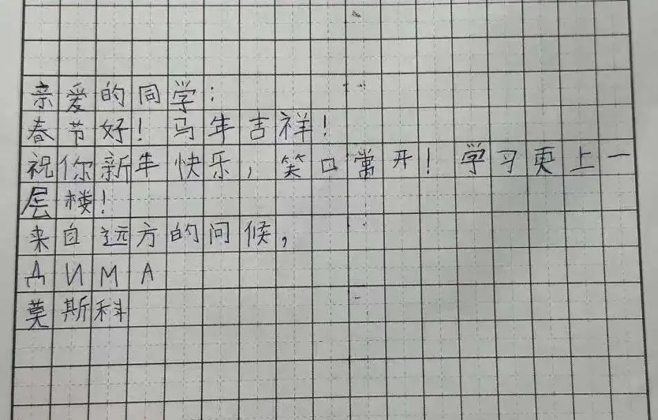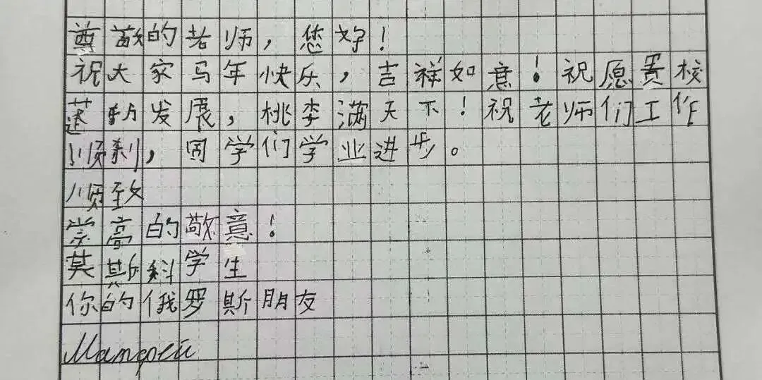 新春伊始,万象更新。中国农历新年期间,一份来自远方的特别礼物温暖了燕子矶中学师生的心。我校的俄方友好学校——俄罗斯莫斯科市625学校的同学们用中文,精心书写成信,跨越千山万水,为中国朋友们送来了美好的新年祝福。一笔一划,皆是深情厚谊。这份特别的礼物,不仅是对中国传统节日的诚挚问候,更是两校青年一代渴望相互了解、增进友谊的美好象征。