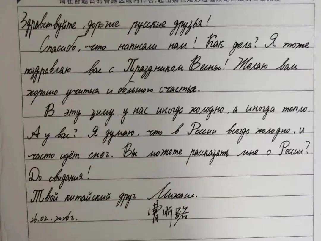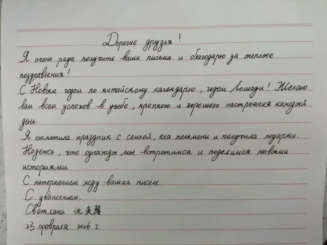 书信虽薄,情意却重。此次书信往来,不仅仅是简单的节日互贺,更是两校在“中俄教育年”背景下,深化人文交流、促进民心相通的生动实践。它为两校学生搭建了一座直接沟通的桥梁,让语言学习从课堂走向生活,让文化理解从书本走向心灵。