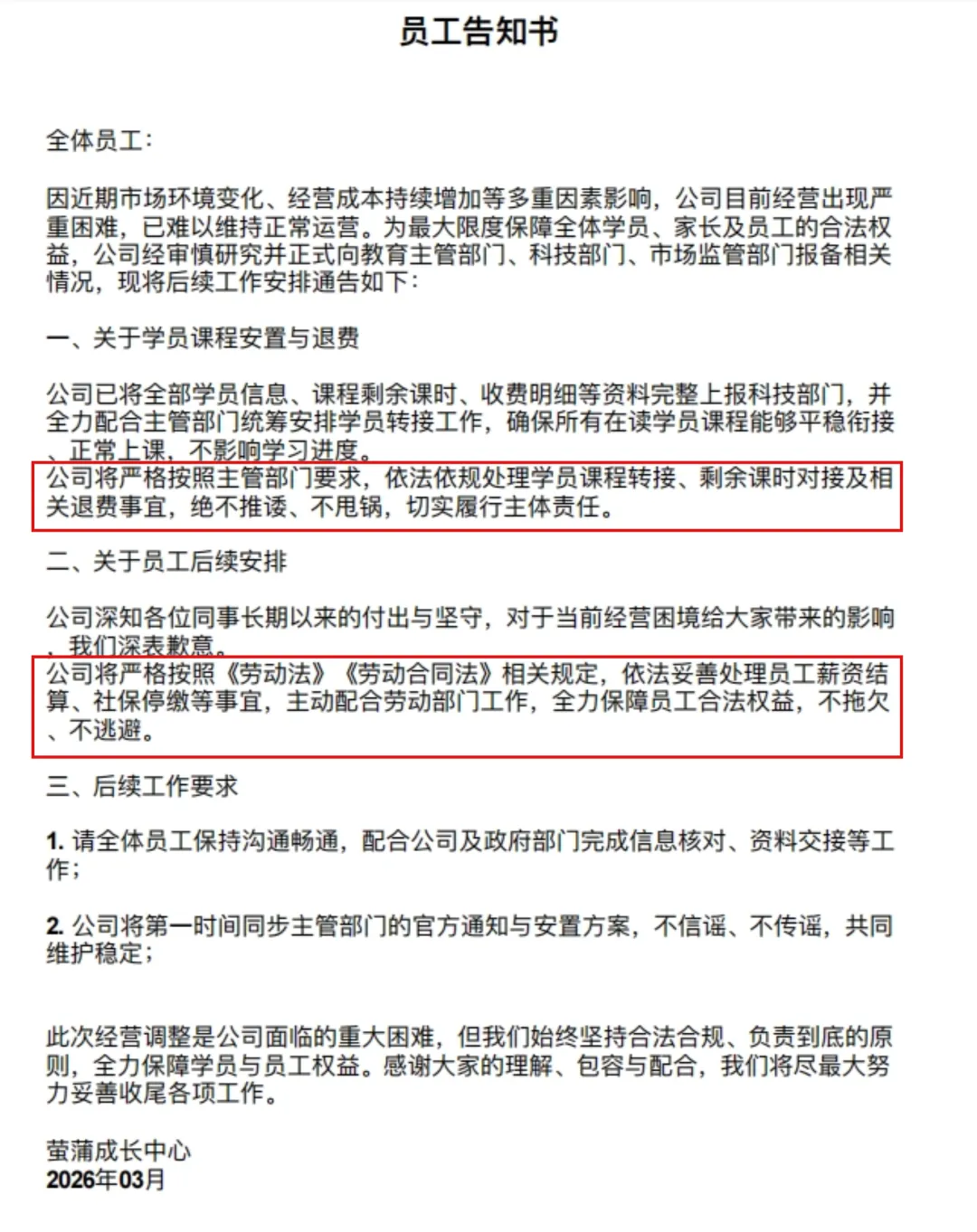 只希望,这家机构能如告知书所言,“不推诿、不甩锅”,给家长和员工一个体面的交代。也希望,这个行业的信任,不要再被这样一次次地透支了。