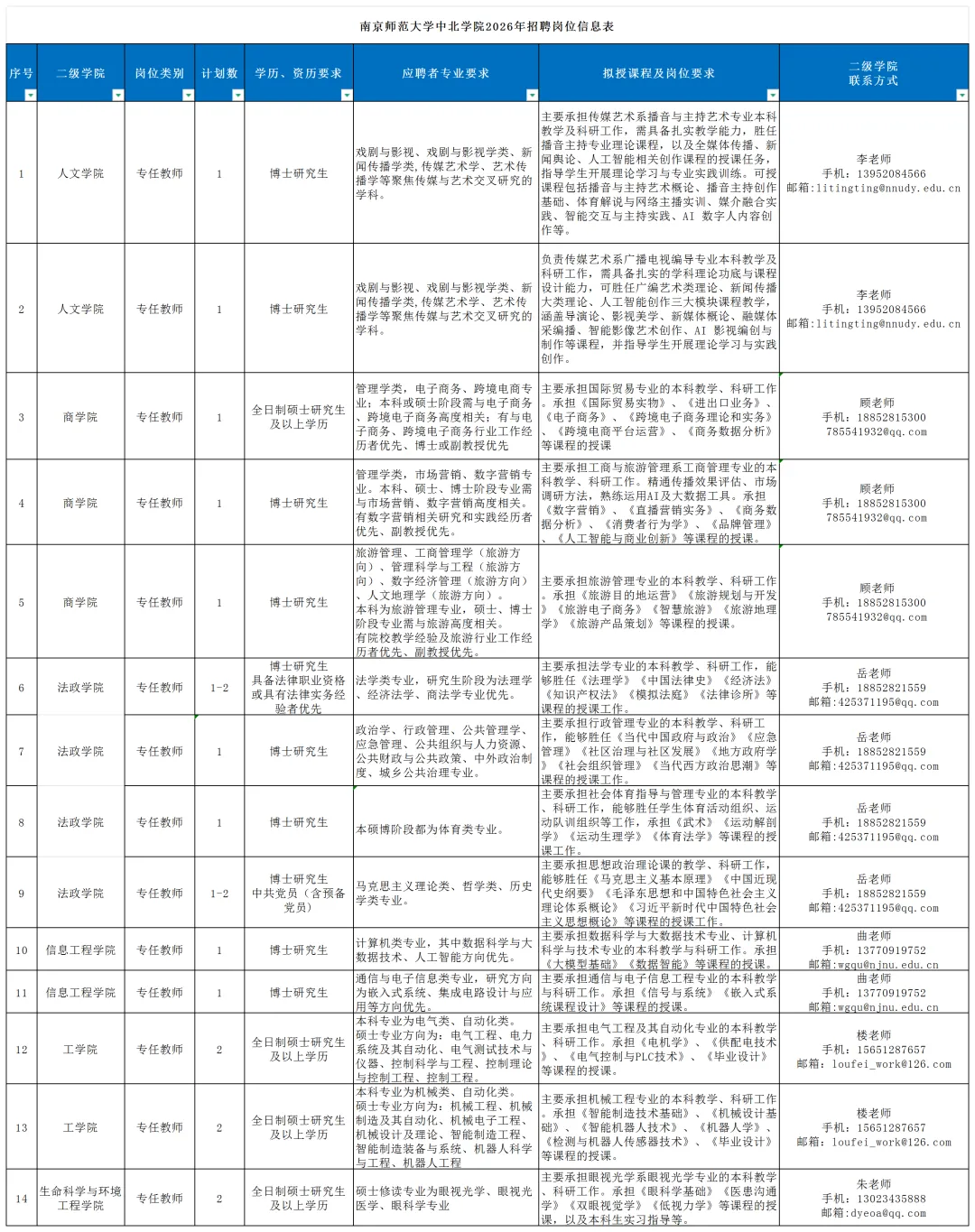 招聘岗位及要求详见《南京师范大学中北学院2026年招聘岗位表》(下图),招满为止。