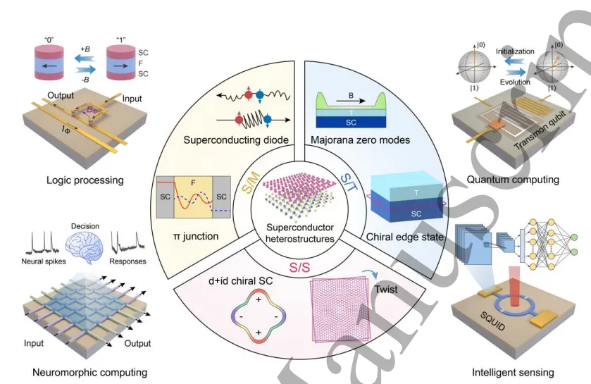 展示超导体 / 磁体(S/M)、超导体 / 拓扑材料(S/T)、超导体 / 超导体(S/S)三类异质结,及其衍生的非常规超导态(自旋三重态配对、拓扑超导、非互易 / 手征超导输运),并示意其在量子器件(超导二极管、马约拉纳零能模器件)与量子计算、神经形态计算等领域的应用。