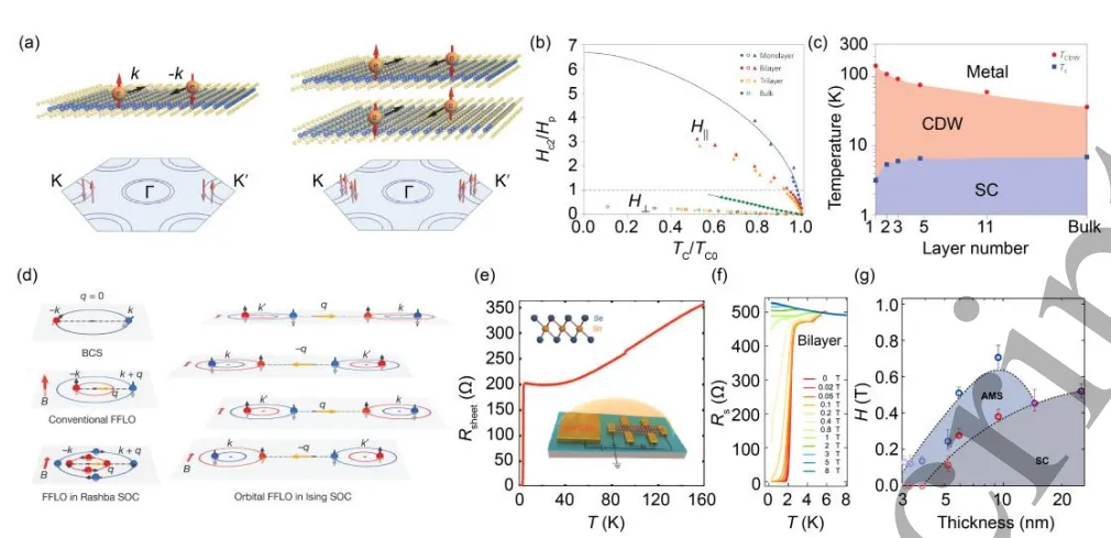 (a) 单层 NbSe₂的自旋 - 动量锁定与双层 / 块体 NbSe₂的自旋 - 层锁定示意图。(b) 不同厚度 NbSe₂样品在面外(空心符号)与面内(实心符号)磁场下,归一化上临界场与转变温度的关系(虚线为泡利顺磁极限)。(c) NbSe₂的厚度 - 温度相图。(d) Rashba 与多层伊辛超导体中零动量 BCS 配对、有限动量 FFLO 配对及轨道 FFLO 态的对比。(e) SnSe₂电双层晶体管(EDLT)的温度依赖电阻,显示栅极诱导超导转变。(f) 双层 MoS₂器件在垂直磁场下的温度依赖面电阻,证实栅极诱导超导。(g) 2H-Ta₂S₃Se 的厚度 - 磁场相图。