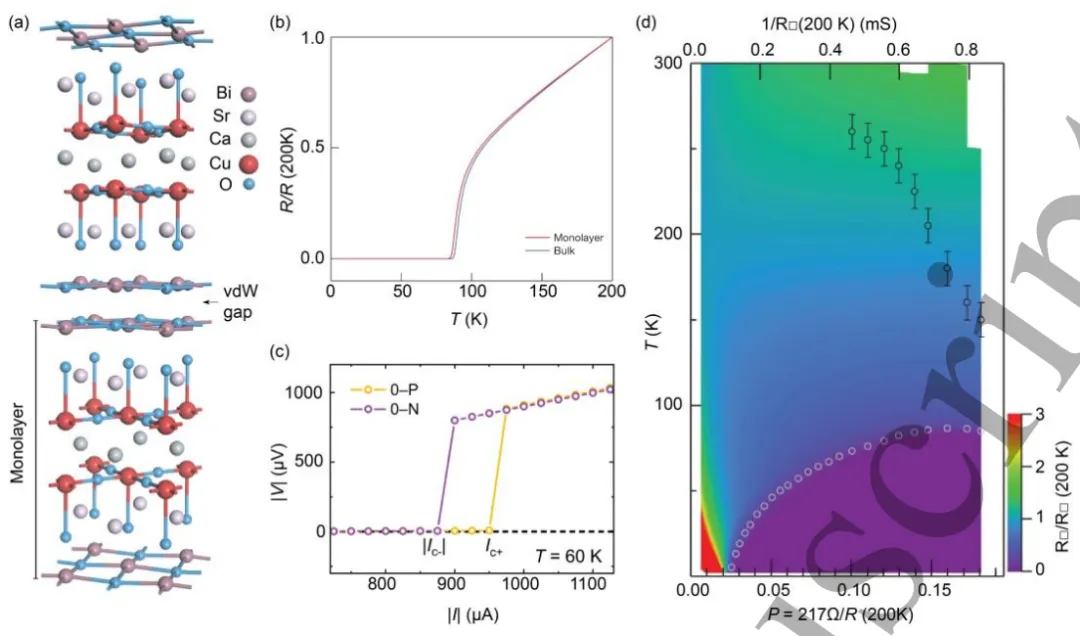(a) Bi-2212 的晶体结构(“单层” 对应半晶胞,含两个 CuO₂面)。(b) 单层 Bi-2212 器件与最优掺杂块体晶体的温度依赖电阻对比。(c) 60 K 下的电流 - 电压特性,显示非互易临界电流(Ic⁺≠|Ic⁻|)。(d) 电阻随温度与掺杂的变化,展示相图中的输运行为演化。