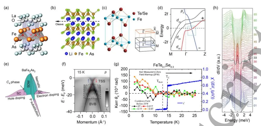 (a)-(c) 典型铁基超导体的晶体结构:LaOFeAs(a)、LiFeAs(b)、Fe (Se,Te)(c)。(d) Fe (Se,Te) 的第一性原理能带结构,突出自旋 - 轨道耦合诱导的带隙反转。(e) BaFe₂As₂的示意相图,包含向列序、自旋密度波、C₄对称磁相及超导相。(f) Fe (Se,Te) 的能带结构,显示体相空穴型价带与类狄拉克拓扑表面态。(g) 零场升温 Kerr 旋转信号(揭示时间反演对称性破缺)与体相磁化率(标记超导转变)。(h) 涡旋核的空间分辨隧道谱。