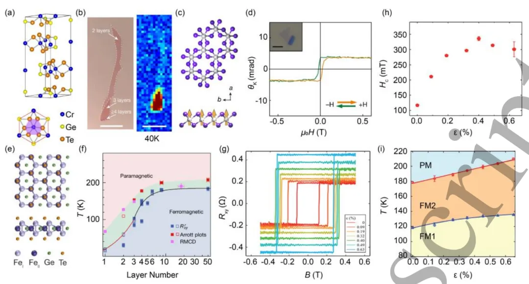 (a) Cr₂Ge₂Te₆的侧面与顶面晶体结构。(b) SiO₂/Si 衬底上剥离的 Cr₂Ge₂Te₆原子层光学图像(左)与双层薄片在 40 K、面外磁场下的 Kerr 旋转信号(右)。(c) 单层 CrI₃的面内(上)与面外(下)原子晶格。(d) CrI₃单层的极向磁光克尔(MOKE)信号(插图为单层光学图像,比例尺 2 μm)。(e) 沿 [001](上)与 [010](下)方向观察的单层 FGT 原子结构。(f) FGT 的层数 - 温度相图。(g)-(h) 1.5 K 下 FGT 的应变依赖反常霍尔响应与矫顽场。(i) FGT 的温度 - 应变相图,区分顺磁相(PM)与单畴(FM1)、迷宫畴(FM2)铁磁相。