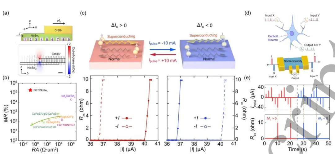 (a) NbSe₂/CrSBr 异质结器件示意图(CrSBr 边缘位于电极间)与面外杂散场模拟分布。(b) 该器件与传统 / 超导自旋电子学器件的磁电阻及电阻 - 面积积对比。(c) 电可调非互易超导输运的示意图与实验验证。(d) 生物皮质神经元与神经晶体管的概念类比,及不同极性态下对电流脉冲的尖峰响应(示意非互易超导器件的神经形态计算潜力)。