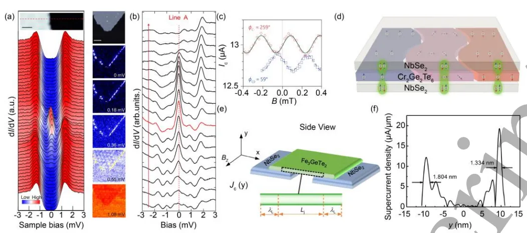 (a) CrBr₃岛边缘的微分电导谱(上方为对应的 STM 形貌图)。(b) 沿涡旋核的空间分辨 dI/dV 谱(Line A)。(c) Cr₂Ge₂Te₆基约瑟夫森结的 SQUID 振荡(红色圆圈、蓝色方块分别为 T=0.9 K 时的临界电流 Ic⁻与 Ic⁰)。(d) 磁化依赖约瑟夫森耦合示意图:垂直磁化利于伊辛库珀对的自旋守恒隧穿(π 相结),面内磁化需自旋翻转隧穿(0 相结),磁畴存在时形成混合 0-π 段。(e) 磁场沿 y 轴的 S/F/S 结示意图。(f) 沿 y 轴的超导电流密度分布,显示两条导电边缘通道。