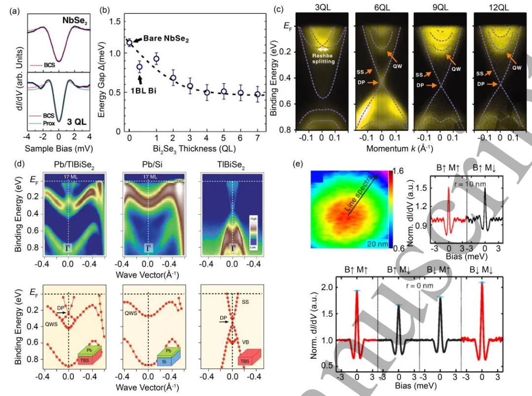 (a) 裸 NbSe₂与 3QL-Bi₂Se₃薄膜的 STS 谱。(b) 拟合提取的诱导超导能隙与 Bi₂Se₃厚度的关系。(c) 不同厚度 Bi₂Se₃薄膜的 ARPES 能带色散。(d) 上:17ML-Pb/TlBiSe₂、17ML-Pb/Si (111) 及裸 TlBiSe₂在 Γ 点附近费米能级的 ARPES 能带结构;下:对应的 MDC/EDC 峰位实验色散。(e) 左:0.1 T 下 5QL-Bi₂Te₃/NbSe₂拓扑超导体上涡旋的零偏压 dI/dV 成像(非自旋极化针尖);下:自旋极化针尖在涡旋中心的 dI/dV 谱;右:自旋极化针尖在涡旋中心外~10 nm 处的 dI/dV 谱。
