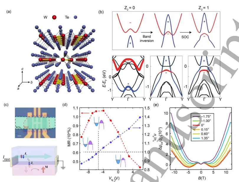 (a) WTe₂的晶体结构。(b) 上:体相能带从拓扑平庸相到非平庸相再到自旋 - 轨道耦合诱导带隙的演化示意图;下:WTe₂从 1T 相到无自旋 - 轨道耦合 1T'- 相再到有自旋 - 轨道耦合 1T'- 相的计算能带结构。(c) 上:FGT/WTe₂器件的光学图像;下:WTe₂薄片中电流诱导自旋极化示意图。(d) 栅压依赖磁电阻(MR)与载流子密度比的对比。(e) 薄 WTe₂中的负纵向磁电阻。