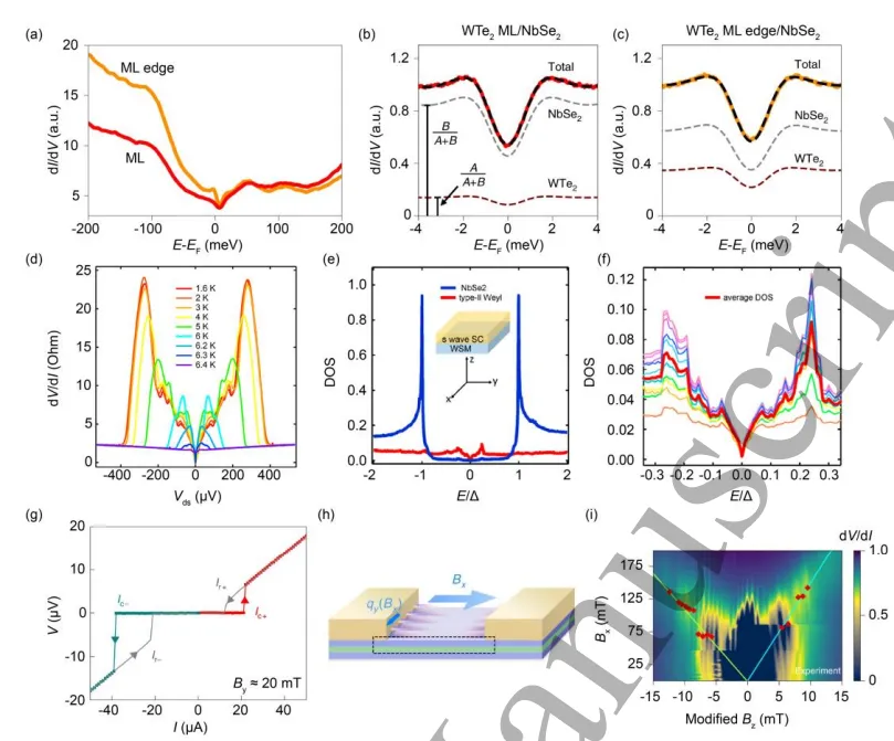(a) 单层 WTe₂体相(远离边缘)与边缘的代表性 dI/dV 谱,显示量子自旋霍尔边缘态导致的局域态密度(LDOS)增强。(b)-(c) 单层 WTe₂/NbSe₂体相(b)与边缘(c)的代表性隧道谱拟合。(d) 不同温度下 WTe₂的微分电阻谱,显示主超导峰内的亚能隙特征。(e)-(f) 超导 WTe₂/NbSe₂异质结的态密度(DOS)理论计算:(e) II 型外尔半金属(WTe₂)与 s 波超导体(NbSe₂)的超导态 DOS;(f) (e)中 WTe₂的 DOS 放大图(红线),细线为 WTe₂不同层的 DOS。(g) 20 mK、面内磁场 B_y=20 mT 下 NiTe₂/Nb 约瑟夫森结(d=350 nm)的 I-V 曲线,显示非互易临界电流。(h) 电流方向面内磁场下结的示意图,显示 y 方向有限动量库珀对调制的形成。(i) 同一 350 nm 结的 dV/dI 与面内(B_x)、面外(B_z)磁场的关系,显示面内磁场诱导的干涉图样演化。