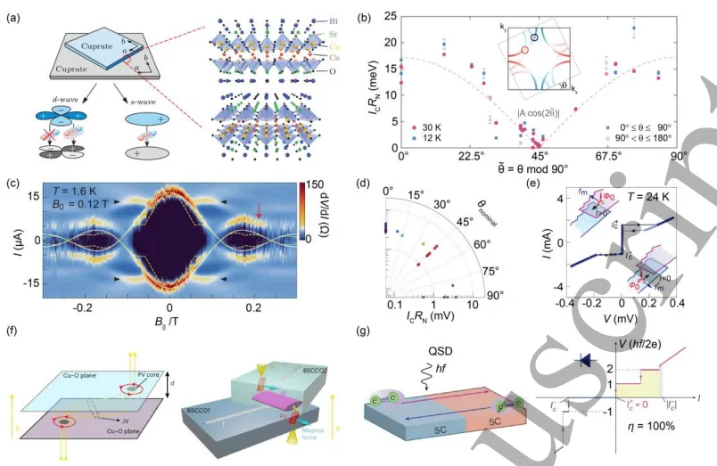 (a) 左:s 波、d 波或 d+id 波配对的扭转铜氧化物双晶约瑟夫森隧穿示意图;右:45° 扭转 Bi₂Sr₂CaCu₂O₈(Bi-2212)界面的原子结构。(b) 30 K 与 12 K 下 IcR_N 的角度依赖,显示近乎非相干隧穿。(c) 44.8° 扭转 Bi-2201 约瑟夫森结的夫琅禾费衍射图样。(d) 欠掺杂 Bi-2212 中约瑟夫森耦合强度与扭转角度的关系。(e) 扭转铜氧化物中约瑟夫森二极管效应的实验观测。(f) 左:带涡旋构型的扭转 BSCCO 结示意图;右:偏置电流诱导的涡旋构型变化(马格努斯力)产生非互易输运。(g) 左:微波辐照下量子化超导二极管(QSD)示意图;右:其 I-V 特性显示完美二极管效率。