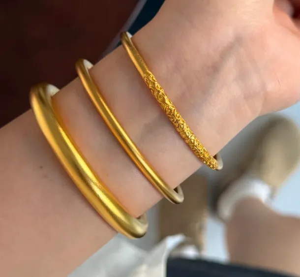 师傅倒是很诚恳,他说:“姑娘,这个设计不错,工艺也细,镶口很平整,通勤戴很好。但要说按克回收价值,就别把它当大金条。”我当时就笑出来了,瞬间释怀。回家路上,我反复观察它在阳光下的反光,K金的亮是干净利落的,和足金那种糯糯软软的金黄完全不一样。晚饭时我给婆婆看了照片,她只说:“你喜欢就好,别老想着它值多少钱,戴着顺眼最要紧。”这句太戳我了。那天夜里我把它和我另一个足金小圈圈一起摆在首饰盘里,一个冷一点的光,一个暖一点的光,像两种心情。第二天我去上班,先戴K金手镯,敲键盘不叮当,地铁拉扶手也不怕变形,午休还被同事问链接,笑死我,这哪来的链接,这是婆婆牌。