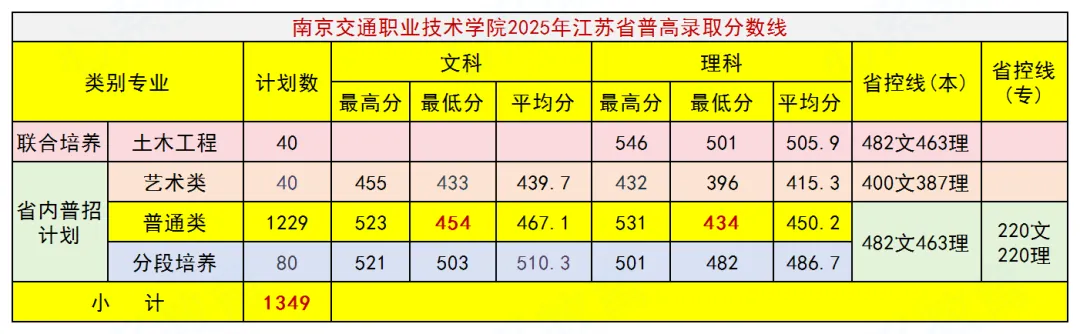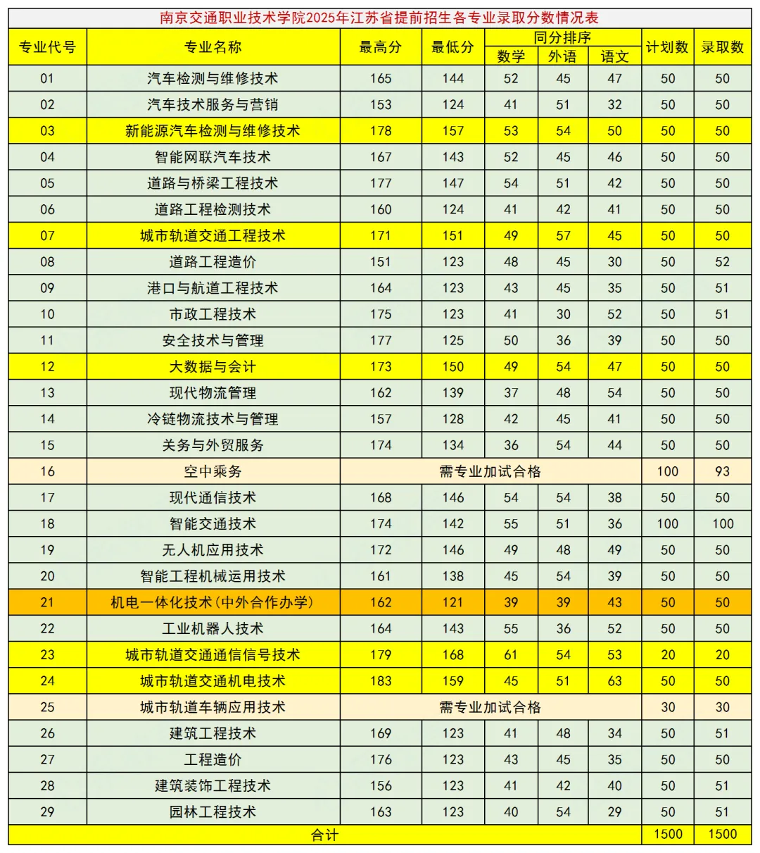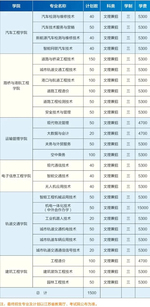 百日誓师已过,2026年高考一天天临近,对于江苏的高三同学而言,本科考不上或者考不上好本科,通过单招(高职院校提前招生)考上一所不错的公办专科学校,也不失为一个好选择。目前各单招学校已经陆续公布2026年提前招生(单招)招生简章,单招报名也即将开始,鉴于近两年公办好专科的报考竞争也较激烈,很多同学已经在专心备战单招考试,甚至不惜花钱到机构里进行封闭式训练和学习。单招报名只能填报一所高职院校,究竟选择哪一所学校报考,令不少同学及家长纠结,这里将通过对各单招院校去年录取情况的分析(含单招和普高招生)及今年提前招生政策要点的梳理,陆续介绍一些单招学校的基本情况,希望能对大家做出选择提供帮助。本文来看看南京交通职业技术学院,先来看学校去年的招生录取情况,下表为该校2025年提前招生(单招)各专业录取分数情况:表中可见,该校去年在江苏省提前招生计划1500人,实际也录取1500人。计划招生人数最多的专业是空中乘务和智能交通技术,实际录取人数最多的是智能交通技术专业。中外合作办学专业录取50人。各专业中录取分数线最高的是城市轨道交通通信信号技术,城市轨道交通机电技术,新能源汽车检测与维修技术,城市轨道交通工程技术,大数据与会计等专业录取分数线相对较高。再看看该校去年通过普通高考在江苏省的招生录取情况,请看下表:各类各专业共计划招生1349人,其中普通类专科1249人,占绝大多数。普通类文科(历史类)录取分数线454分,仅比本科线低28分,最高分高达523分,超出本科线41分。普通类理科(物理类)录取分数线434分,仅比本科线低29分,最高分531分,竟高出本科线68分。可以看出,对于成绩不太理想的同学而言,通过普通高考考进南京交通职业技术学院并不容易,这样来看,通过提前招生(单招)考进去不失为一个明智的选择。接下来看看南京交通职业技术学院今年提前招生(单招)的相关要求及报考注意事项:2026年提前招生计划1500人(与去年相同),招生专业26个。