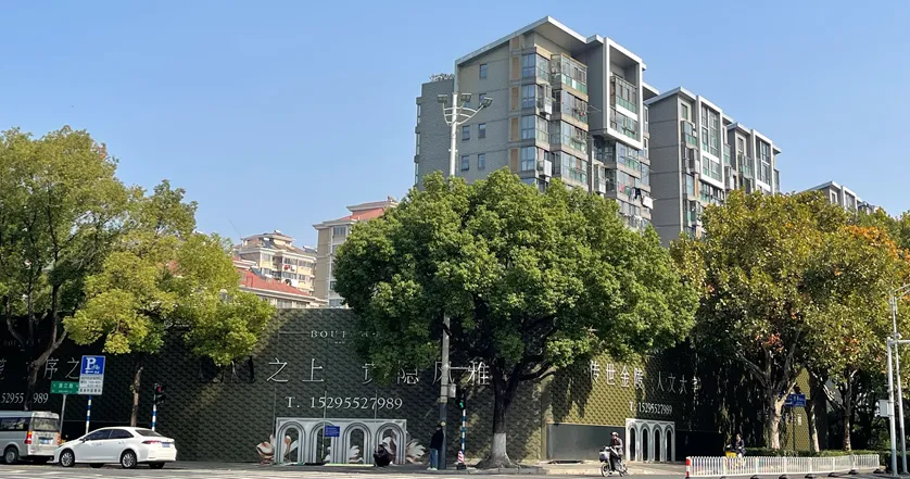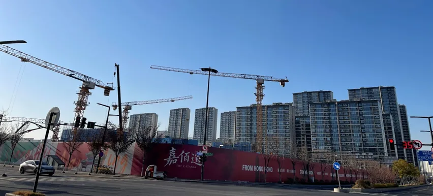 现场的围挡,当然一番艺术范儿。一眼触感上,确实不那么传统豪宅化表达,有些像所谓商业或综合体项目,正如万达广场等传统项目素来运用的色调。