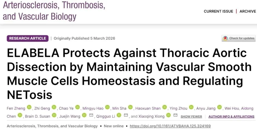 2026年3月5日,南京医科大学基础医学院熊晓青副教授、王觉进教授联合南京医科大学第二附属医院李庆国教授团队在Arteriosclerosis, Thrombosis, and Vascular Biology上发表了题为“ELABELA Protects Against Thoracic Aortic Dissection by Maintaining Vascular Smooth Muscle Cells Homeostasis and Regulating NETosis”的研究论文。该研究首次揭示了内源性多肽ELABELA(ELA)在防治TAD中的关键作用和双重机制,为主动脉夹层的药物干预提供了新靶点。