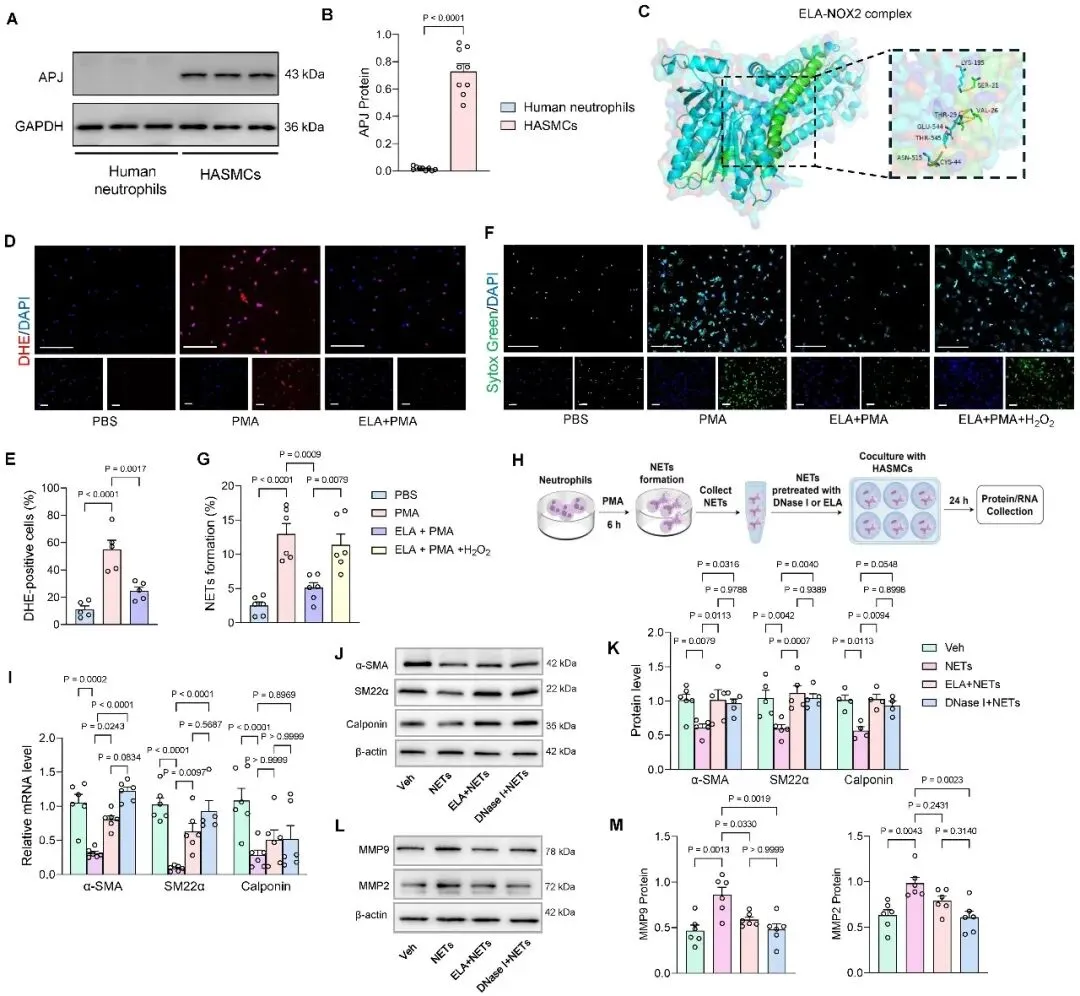 研究团队发现,ELA通过以下两种机制抑制了这一恶性循环:(1) 直接抑制NETs生成:虽然中性粒细胞不表达ELA的经典受体APJ,但分子对接证实,ELA可直接与中性粒细胞表面的NOX2蛋白相互作用,而NOX2激活的活性氧(ROS)途径是NETs生成的经典机制。通过检测活性氧并回补过氧化氢,团队发现ELA通过抑制NOX2/ROS通路,直接抑制了中性粒细胞的NETs生成。(2) 阻断细胞间病理通讯:通过VSMC条件培养基与中性粒细胞的共培养体系,团队揭示了一种关键的细胞间通讯调控机制。ELA通过作用于VSMC上的受体APJ,激活下游AMPK信号通路,有效抑制了由NETs触发的NLRP3/IL-1β级联反应。IL-1β是VSMC分泌并作用于中性粒细胞从而诱导NETs生成的关键反馈信号,ELA通过抑制IL-1β分泌及其介导的细胞间通讯,间接抑制了NETs生成,从而维持VSMC稳态。