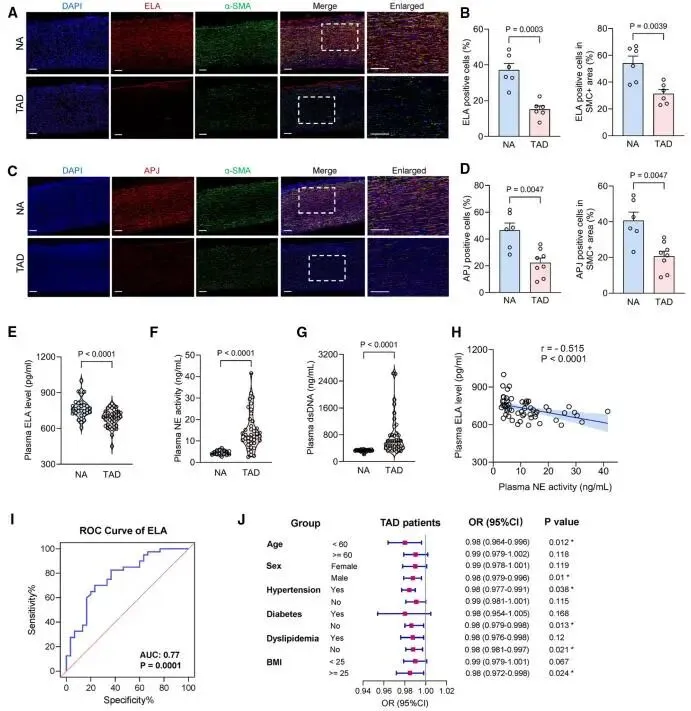 为探究其临床转化潜力,团队发现,在人主动脉夹层组织样本中,定位于VSMC的ELA表达水平显著下调。接下来,通过分析主动脉夹层患者和健康体检者的血浆样本,发现患者血浆中ELA水平与NETs标志物水平呈显著负相关。进一步的ROC曲线分析证实,血浆ELA水平对主动脉夹层的发生具有预测价值(AUC=0.77)。Logistic回归分析则表明,在具有高血压病史、年龄大于60岁等高危因素的男性患者中,低水平的ELA与主动脉夹层的发生风险密切相关。