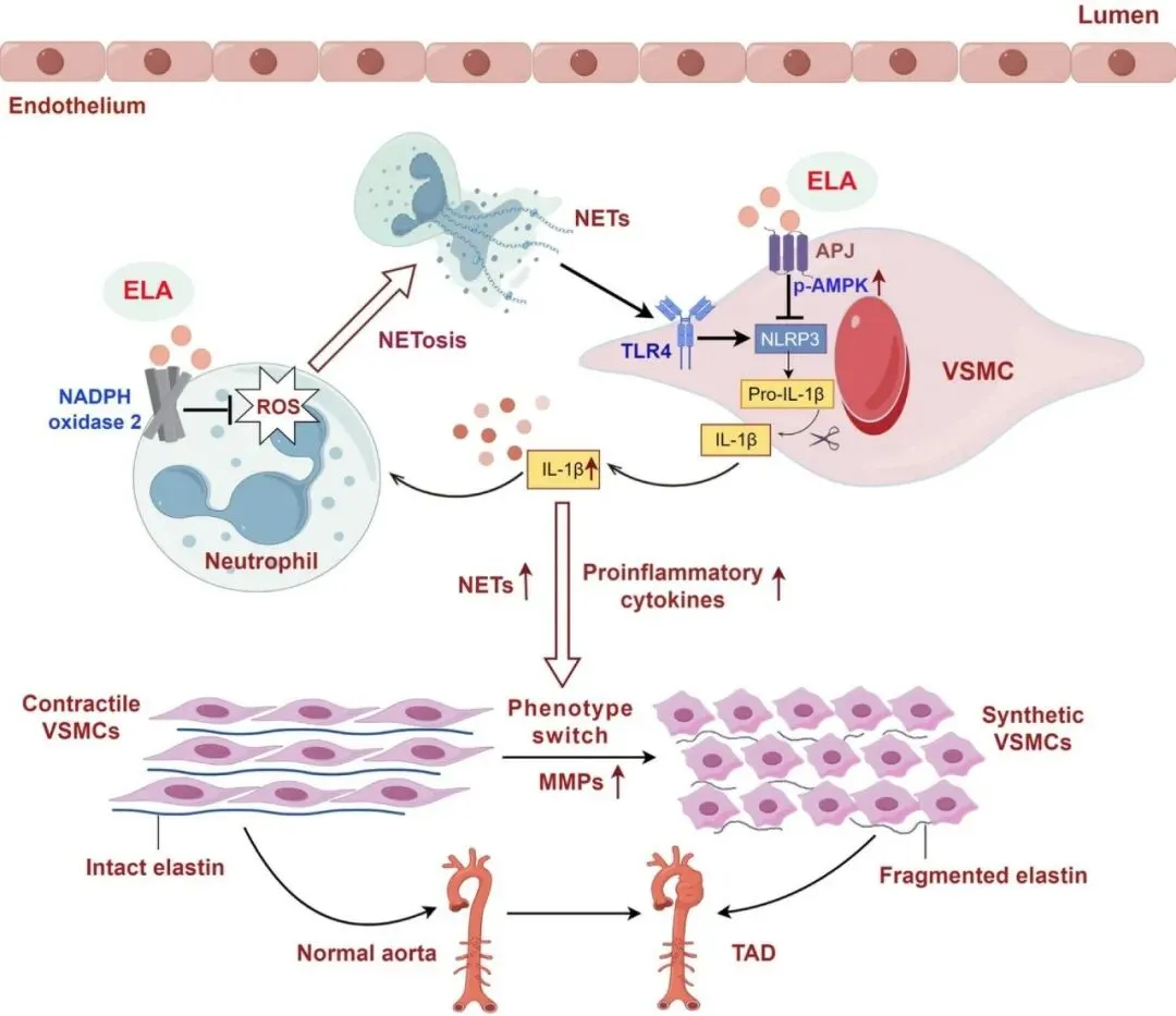 为深入探究其作用机制,团队通过转录组学分析显示,ELA能显著抑制TAD小鼠主动脉中过度激活的NLRP3/IL-1β炎症通路。进一步的细胞和分子实验揭示了一个关键的病理正反馈环路:在TAD状态下,中性粒细胞会大量形成中性粒细胞胞外诱捕网(NETs);NETs可作用于VSMC表面的TLR4受体,激活VSMC内的NLRP3/IL-1β信号通路,而VSMC分泌的IL-1β又会反过来刺激中性粒细胞生成更多NETs,破坏VSMC稳态,形成恶性循环,加速TAD发生发展。