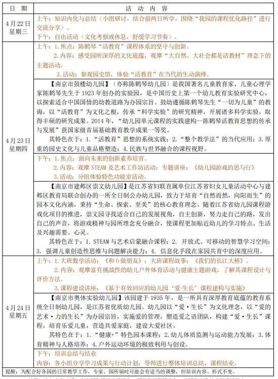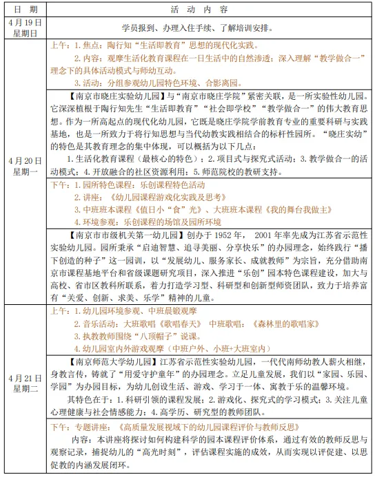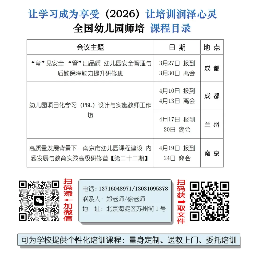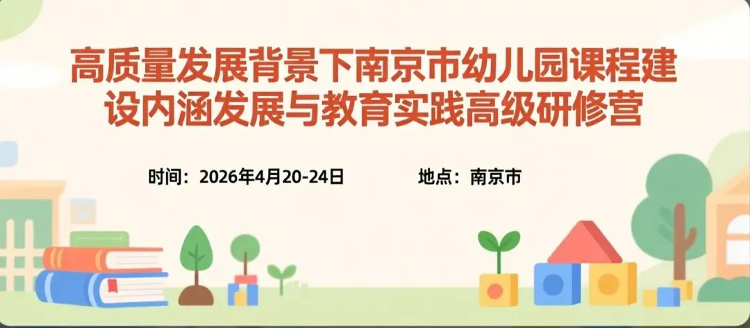 认识课程建设的价值,实施课程游戏化的落地方法,丰富幼儿园文化内涵,打造区域教育品牌。时间:2026年4月20日-24日(4月19日全天报到) (一)、理论溯源:深度理解陶行知“生活教育”与陈鹤琴“活教育”思想的内涵及其在当代幼儿园课程中的实践价值。(二)、实践观摩:通过实地参访南京市多所标杆幼儿园,直观学习其特色课程体系、环境创设与一日活动的组织策略。(三)、能力提升:提升参训教师进行课程规划、实施、评价及教科研创新的能力,促进教师专业成长。(四)、思路拓展:激发课程改革新思路,探索如何将名园经验与自身园所实际相结合,形成独具特色的园本课程。诚邀致力于学前教育改革探索与实践的幼儿园园长、骨干教师、教研员、保教主任及研究人员报名参加,共研共进。