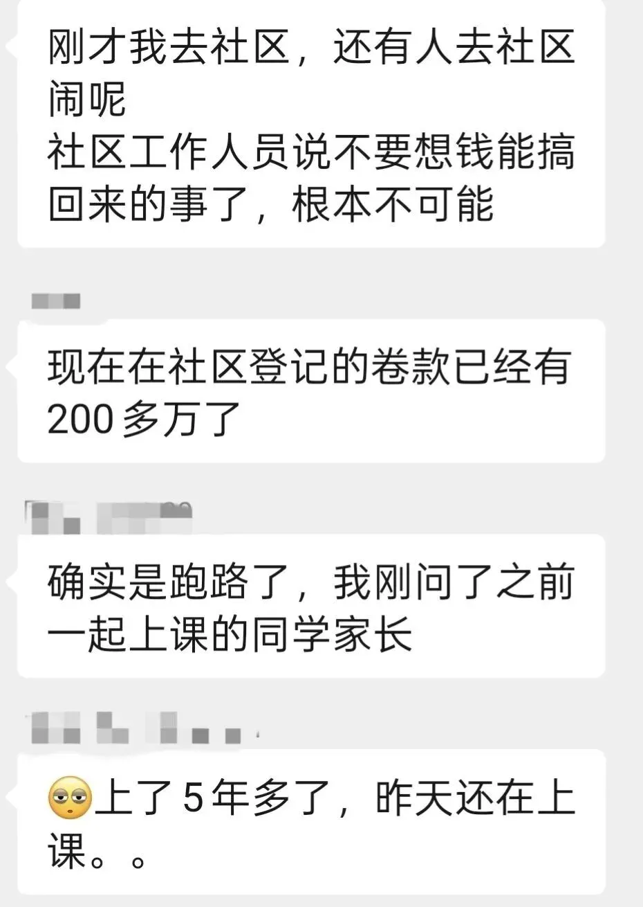 甚至是某小区的业主群里也有了讨论。有网友表示,他们已经上了 5 年,昨天还在上课,结果很多家一起跑路了。据网友表示,在社区登记的卷款已经有了 200多万。数目惊人!
