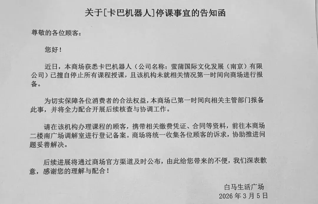 这是一家著名的机器人培训机构,名字叫卡巴机器人(萤蒲成长中心),在南京的多家校区,怎么就突然之间就停运了?!