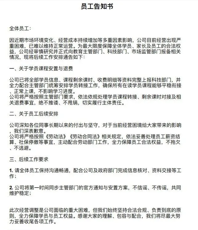 一份据称是发给内部员工的《员工告知书》在社交媒体流传。