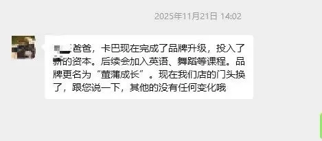 2025年11月21日,机构的老师曾经给家长发了一个消息:卡巴现在完成了品牌升级,投入了新的资本,简单说就是萤蒲收购了卡巴在南京的业务。后续会加入英语、舞蹈等课程,品名也成了“萤蒲成长”,店里的门头也进行了更换,其他没有任何变化。