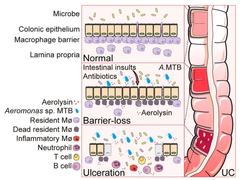 2.菌株与毒素鉴定:从 UC 患者粪便中分离致病菌,经毒性筛选与蛋白质组学鉴定,确定关键致病因子为气溶素毒素。