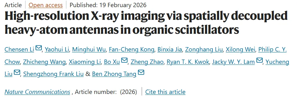 南京理工李晨森/徐勃&陕西师大刘渝城&港中文唐本忠院士等人Nat. Commun.:基于有机闪烁体中空间解耦重原子天线的高分辨X射线成像