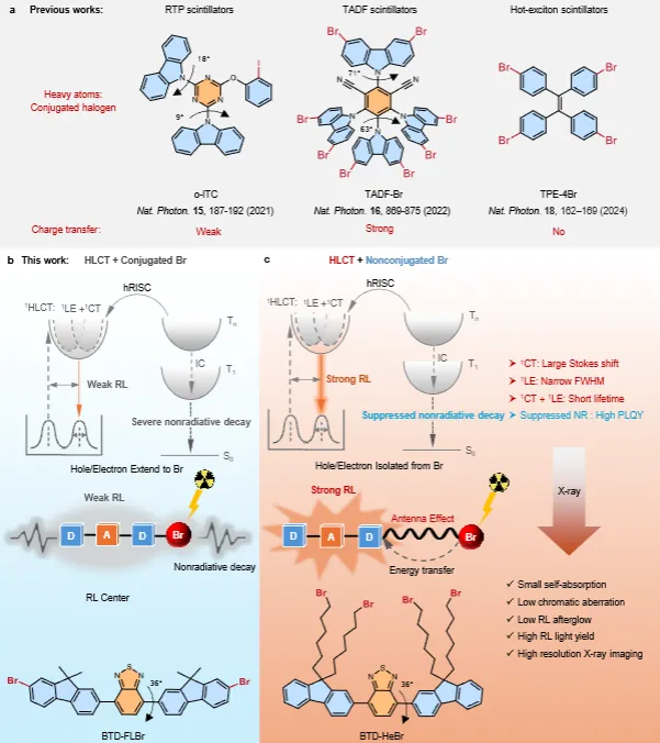 X 射线成像系统能将穿透目标物体的 X 射线光子转化为可视图像,用于分析内部结构,广泛应用于工业无损检测、高能物理、医学放射成像、安全检测和天文探索等领域,空间分辨率是其实际应用的关键指标,直接决定成像质量,目前微电子工业无损检测等精细成像场景对空间分辨率的需求仍未得到满足。有机闪烁体拥有资源丰富、机械柔性好、易加工、成本低和可大面积制备等固有优势,近年来备受关注,其开发需优化多个关键参数:短辐射寿命(<10 ns)可实现快速动态 X 射线成像和医学诊断;窄辐射发光半高宽(<60 nm)能减少散射和噪声,提升成像分辨率、对比度与检测准确性;大斯托克斯位移(>100 nm)可降低自吸收,保证激发能充分利用;高光致发光量子效率(>90%)与 X 射线到光的高转换效率密切相关。电荷转移过程对调控有机发光材料的辐射寿命、发射带宽等关键光物理性质至关重要,但现有有机闪烁体虽在三重态激子利用效率上有进展,却无法通过电荷转移调控实现光物理性质的分子设计,难以满足高分辨率 X 射线成像需求。杂化局域 - 电荷转移分子具有部分扭曲的给体 - 受体结构,电荷转移程度适中,兼具局域激发态振子强度大、电荷转移态系间窜越能力强的特点,还能通过高能反向系间窜越实现高三重态激子利用,弱束缚电荷转移激子还能带来大斯托克斯位移,在高分辨率 X 射线成像中极具潜力。重原子因原子序数高,能通过光电效应高效吸收 X 射线光子,传统有机闪烁体常将卤素重原子共价连接在苯环外围以提升吸收截面,但重原子 -π 共轭相互作用会导致空穴 - 电子离域,引发显著非辐射跃迁,形成 X 射线吸收提升与辐射效率降低的固有权衡,严重限制其辐射发光性能和高灵敏度成像应用,因此亟需创新的重原子工程策略解决这一难题。